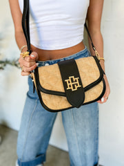 Elevate your style with the Griffin Crossbody Bag in Natural and Black. Crafted from straw material with timeless diamond quilting and black faux lambskin, it showcases the signature shiny gold Caroline Hill logo on a magnetic flap. Inside, stay organized with a zippered pocket and two open compartments, while its structured design keeps the bag looking polished all day. Adjustable Strap for ultimate comfort.