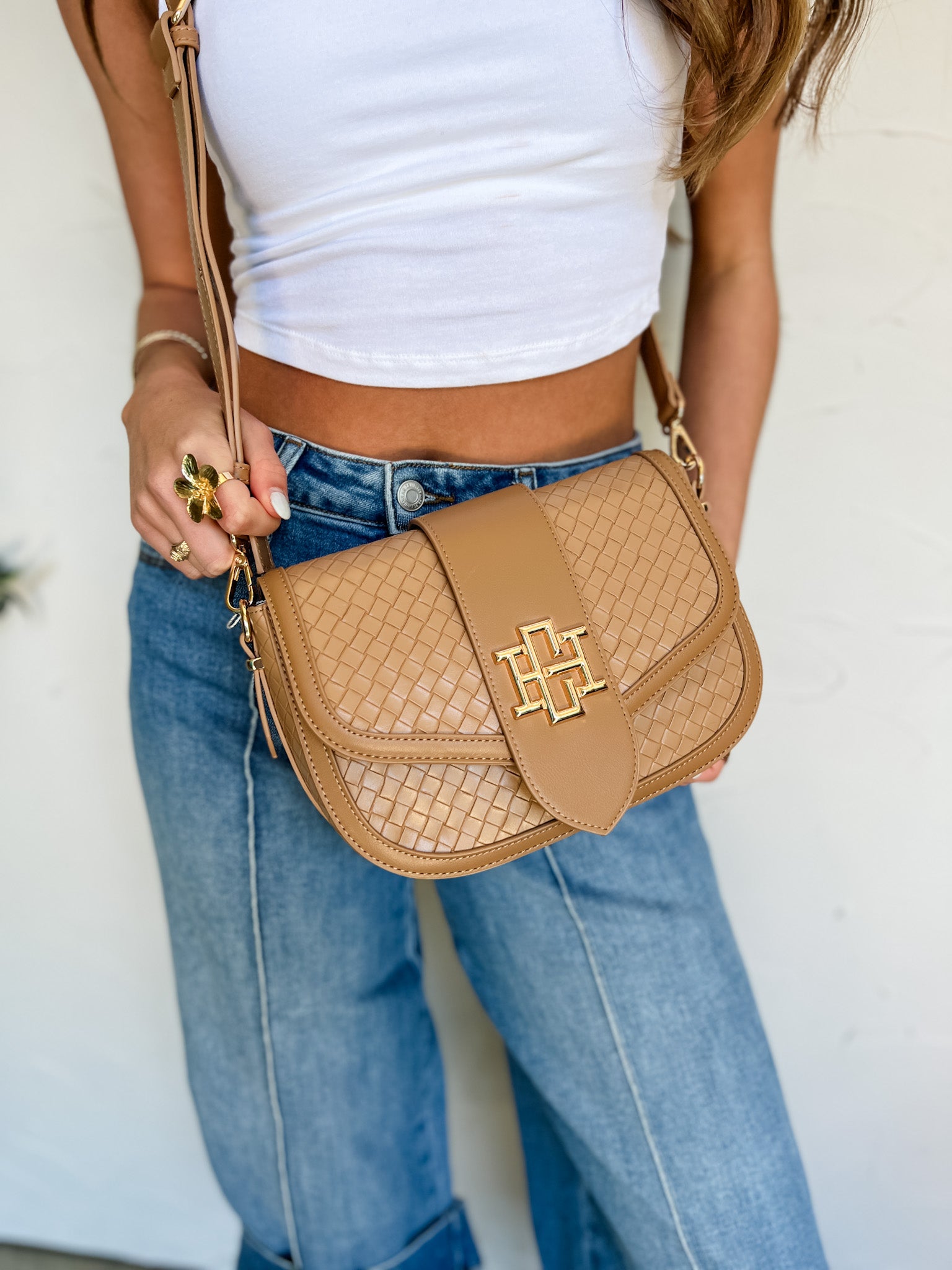 Elevate your style with the Griffin Crossbody Bag in Woven Tan. Crafted from straw material with timeless diamond quilting and black faux lambskin, it showcases the signature shiny gold Caroline Hill logo on a magnetic flap. Inside, stay organized with a zippered pocket and two open compartments, while its structured design keeps the bag looking polished all day. Adjustable Strap for ultimate comfort.