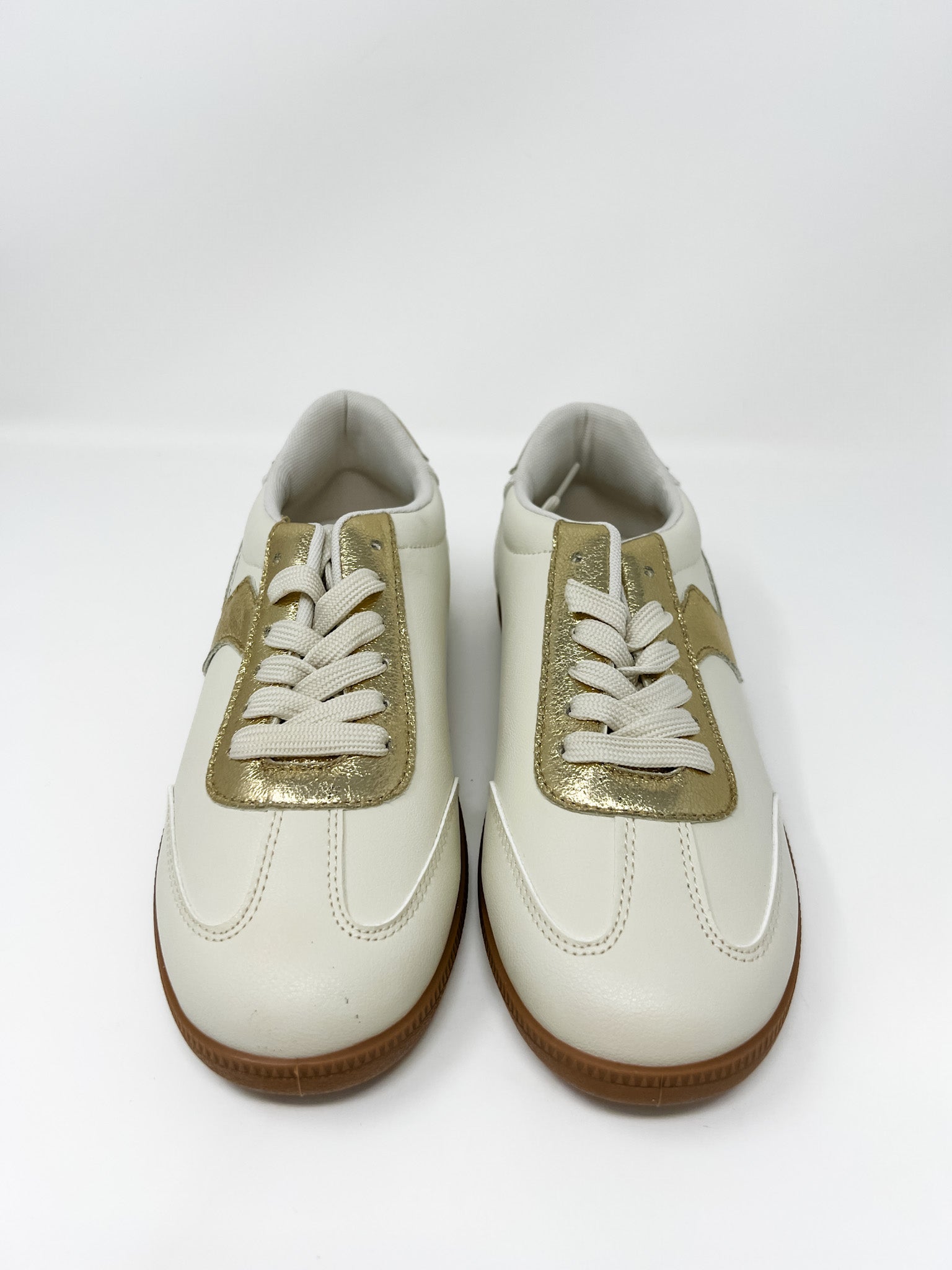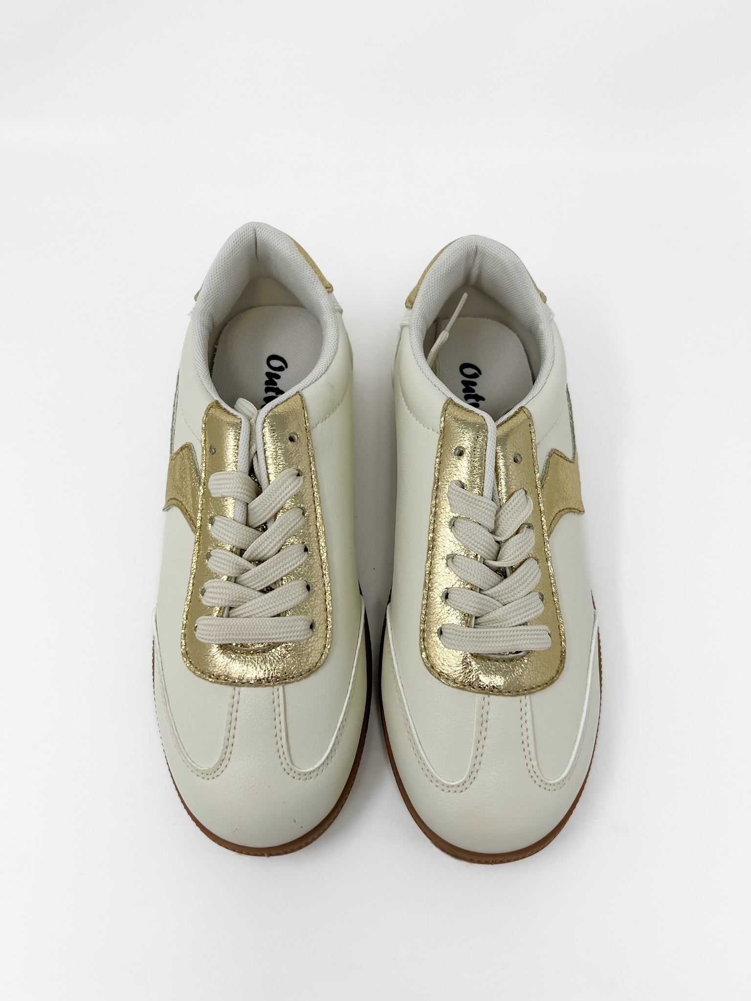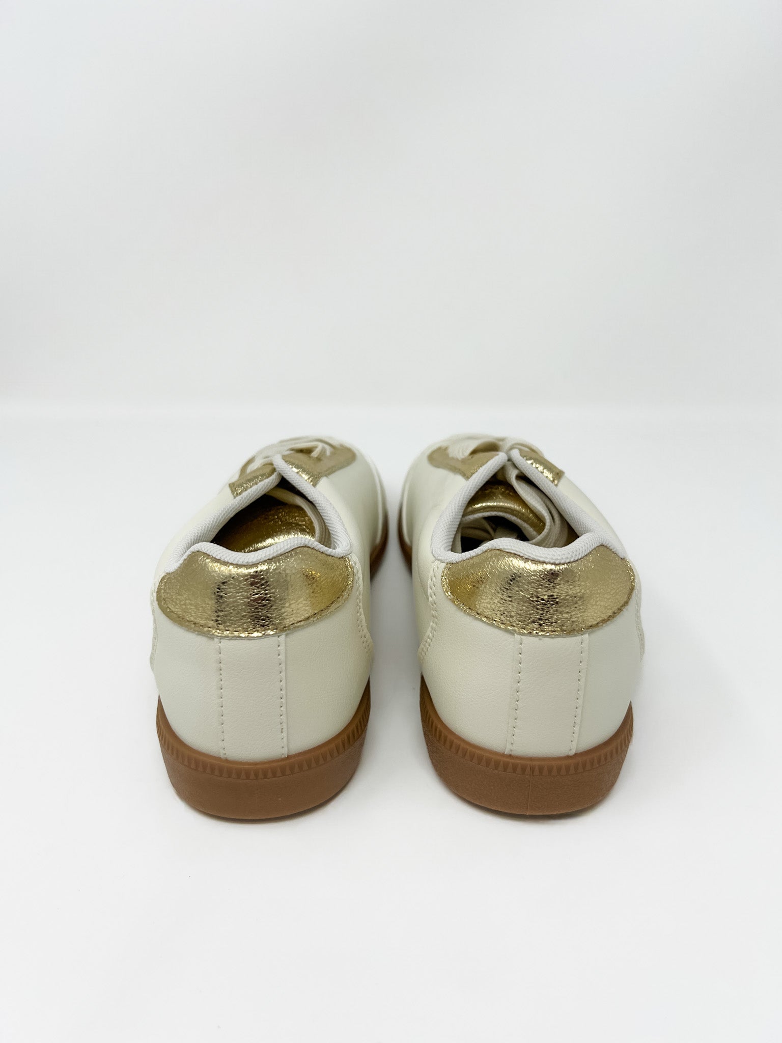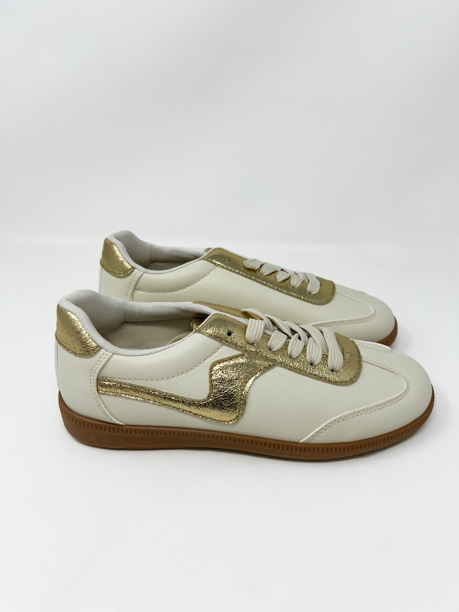 Meet your new go-to kicks: these white and gold sneakers are where sporty meets glam. Featuring a crisp white base with bold gold accents, they add just the right amount of shine to any outfit. Whether you're running errands or dressing down a dress, these sneakers bring comfort, style, and a touch of sparkle to every step. Chic, versatile, and effortlessly cool—just like you.