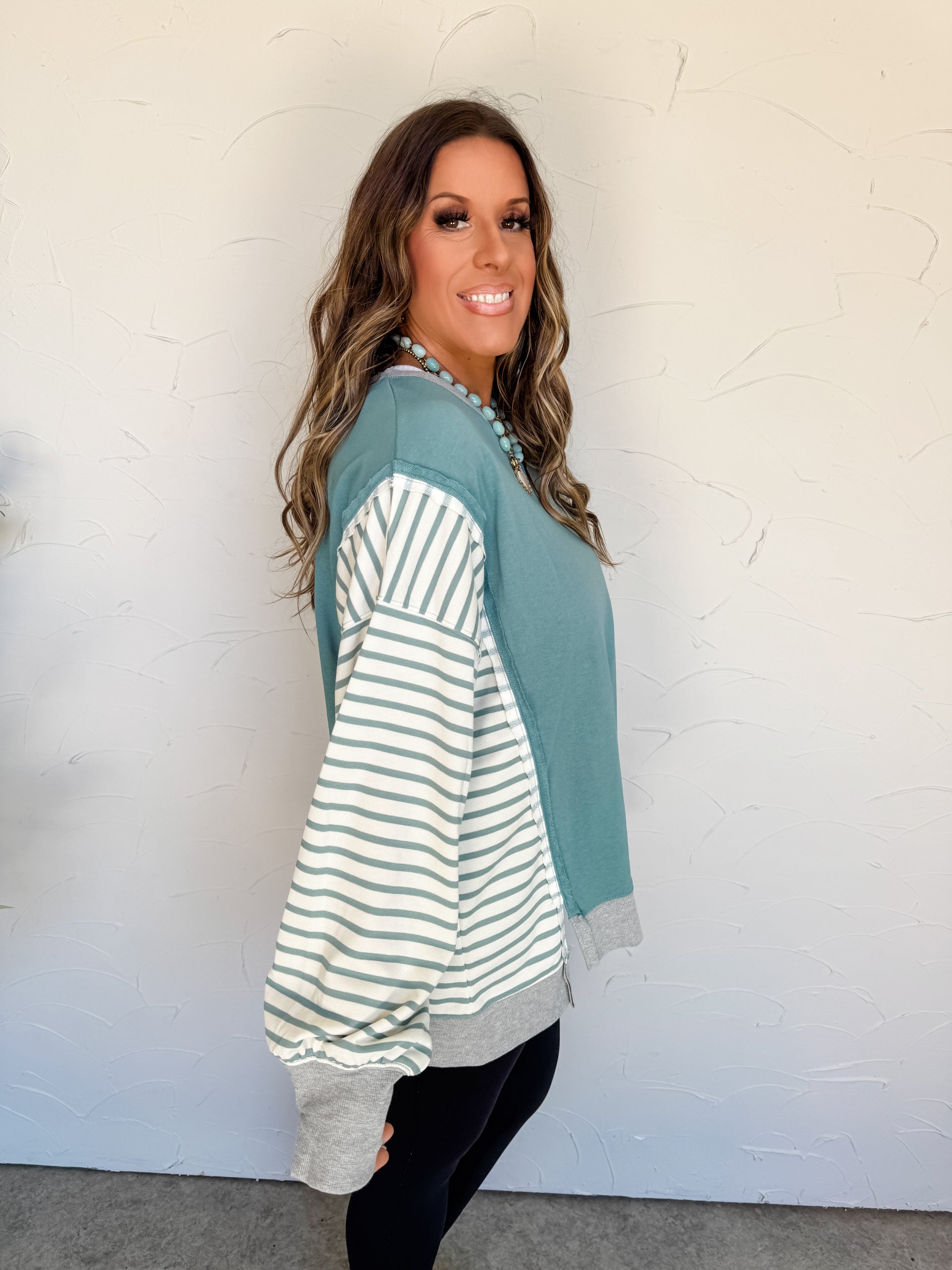 In No Hurry Oversized Striped Casual Knit Top- Sage