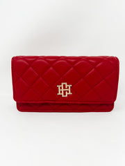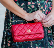 This stylish textured metallic vegan leather handbag is a great statement piece. It has a gold link crossbody strap featuring subtle accent pearls for a classy touch. The strap is removable so the bag can be carried as a fashionable clutch as well. It has a front magnetic flap that features the Caroline Hill logo, and the vegan leather interior has two separate sections with card slots to keep you organized when using.