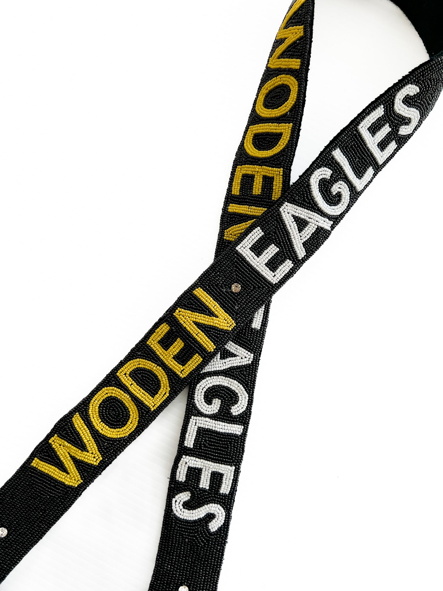 Show your Eagle pride in style! This black and yellow beaded strap shines with bold lettering and gold-tone hardware—perfect for cheering Woden on from the stands or carrying your school spirit every day.