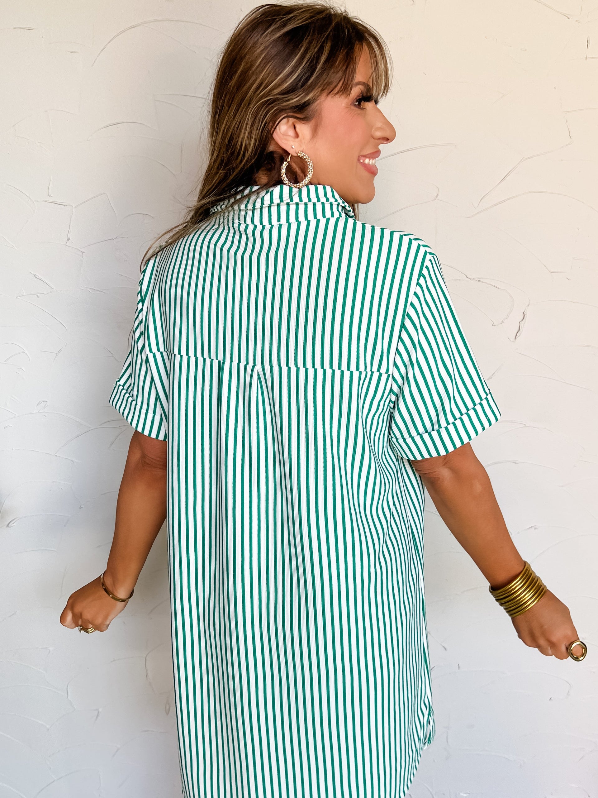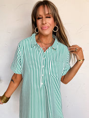 Down Memory Lane Stripe Button Up Shirt Dress- Kelly Green