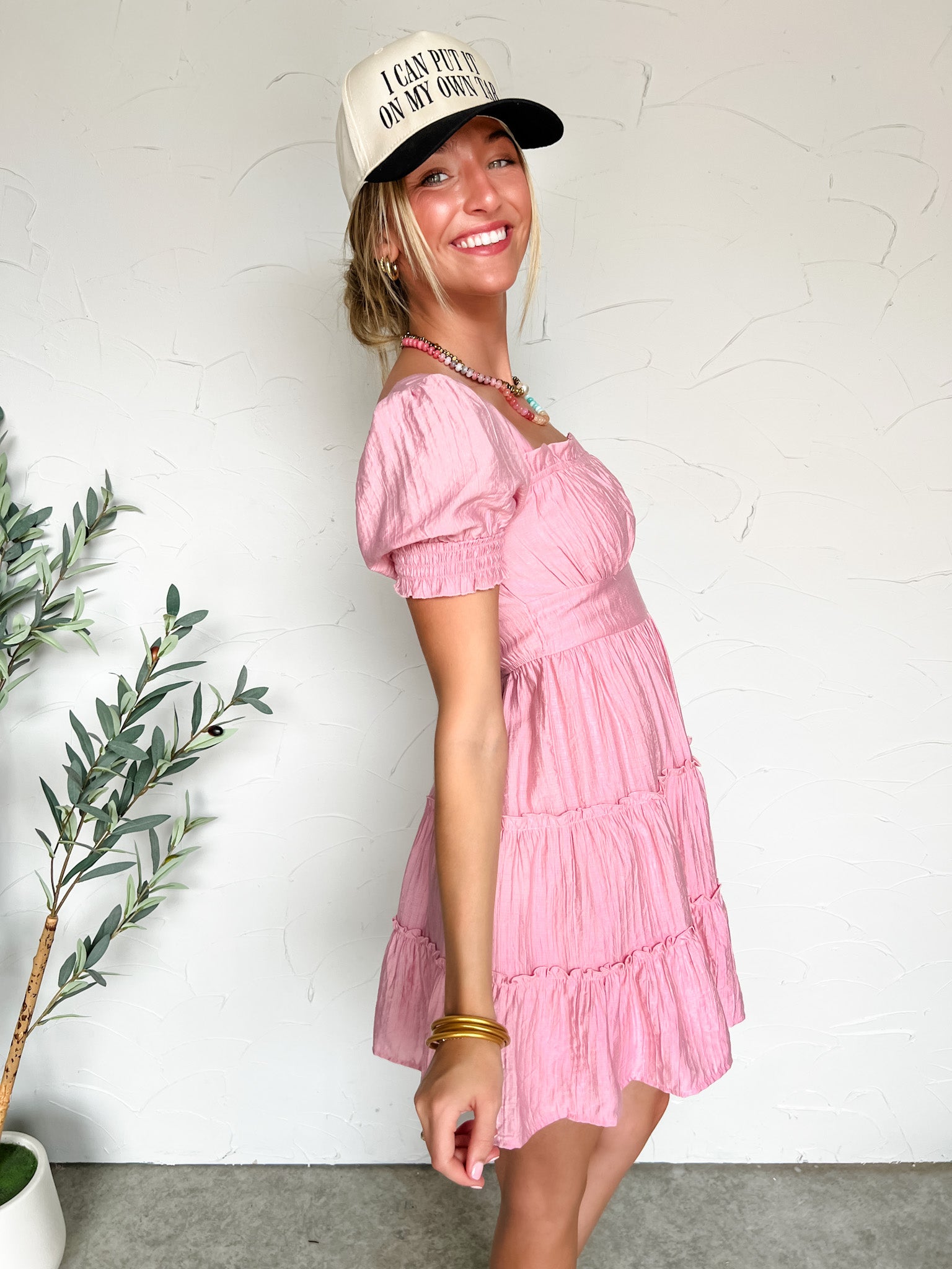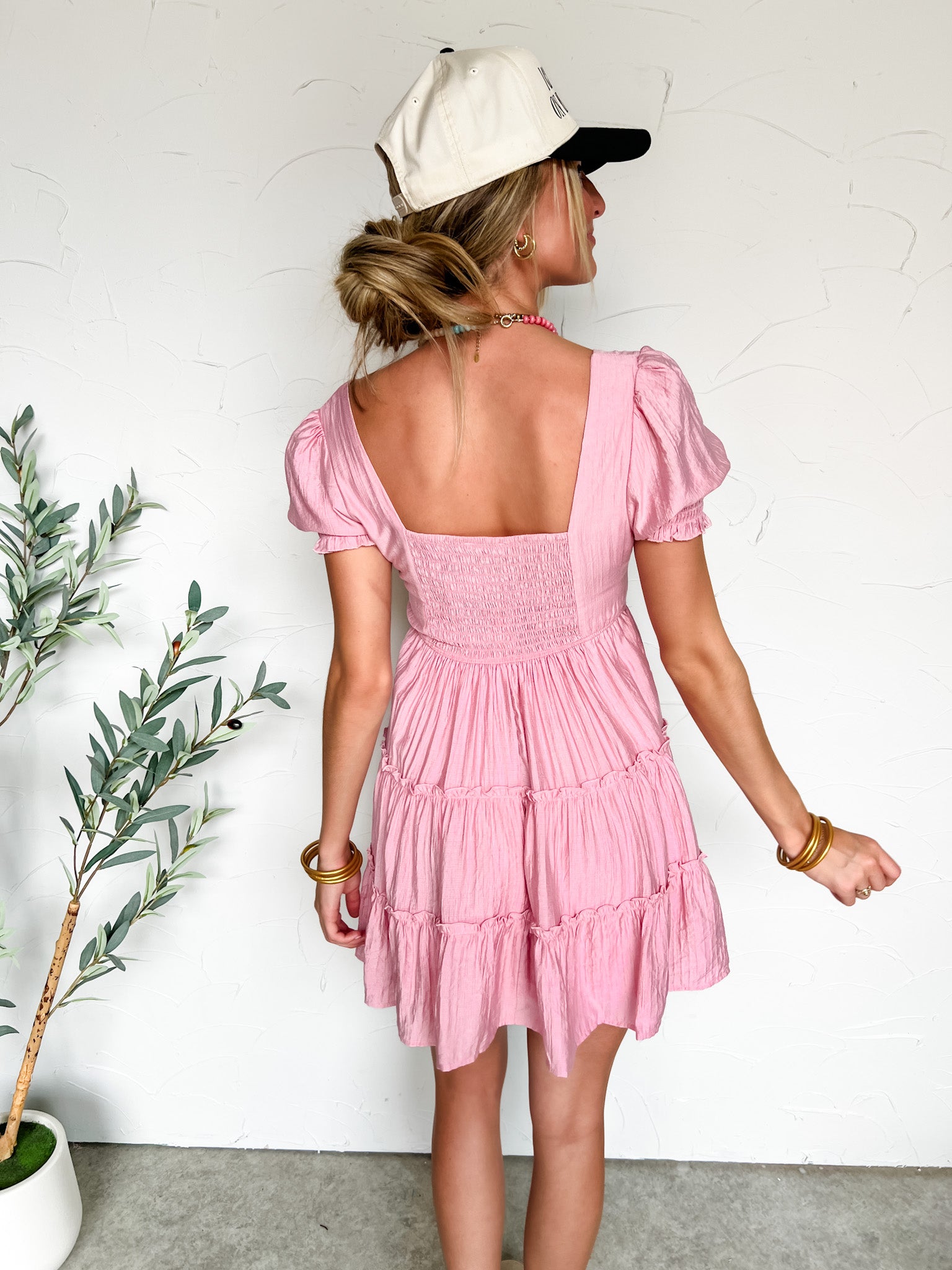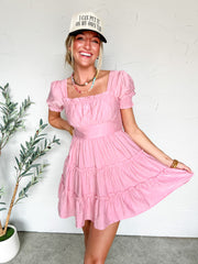 For The Girls Square Neck Tiered Mini Dress- Pink