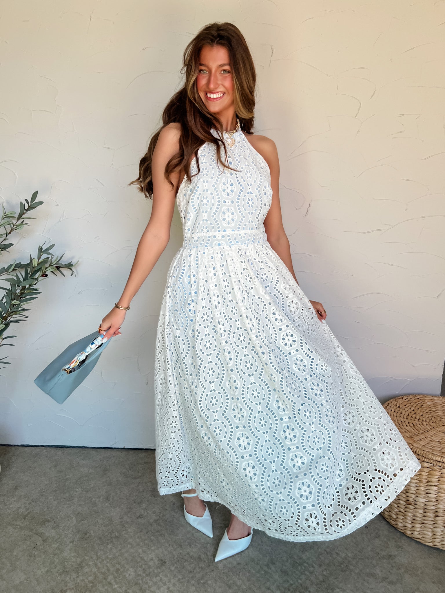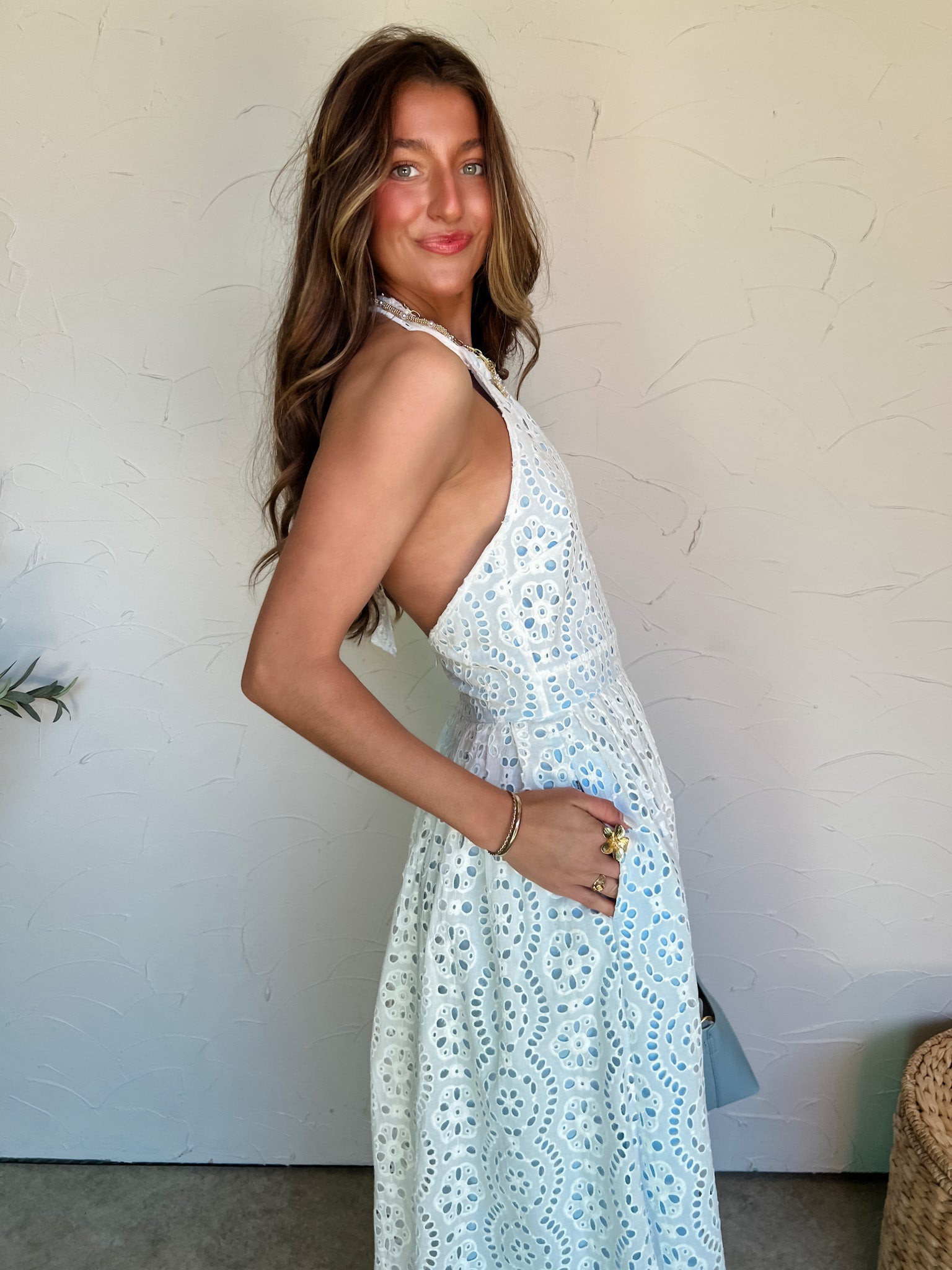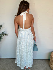 The Wind Whispers Eyelet Lace Halter Maxi Dress