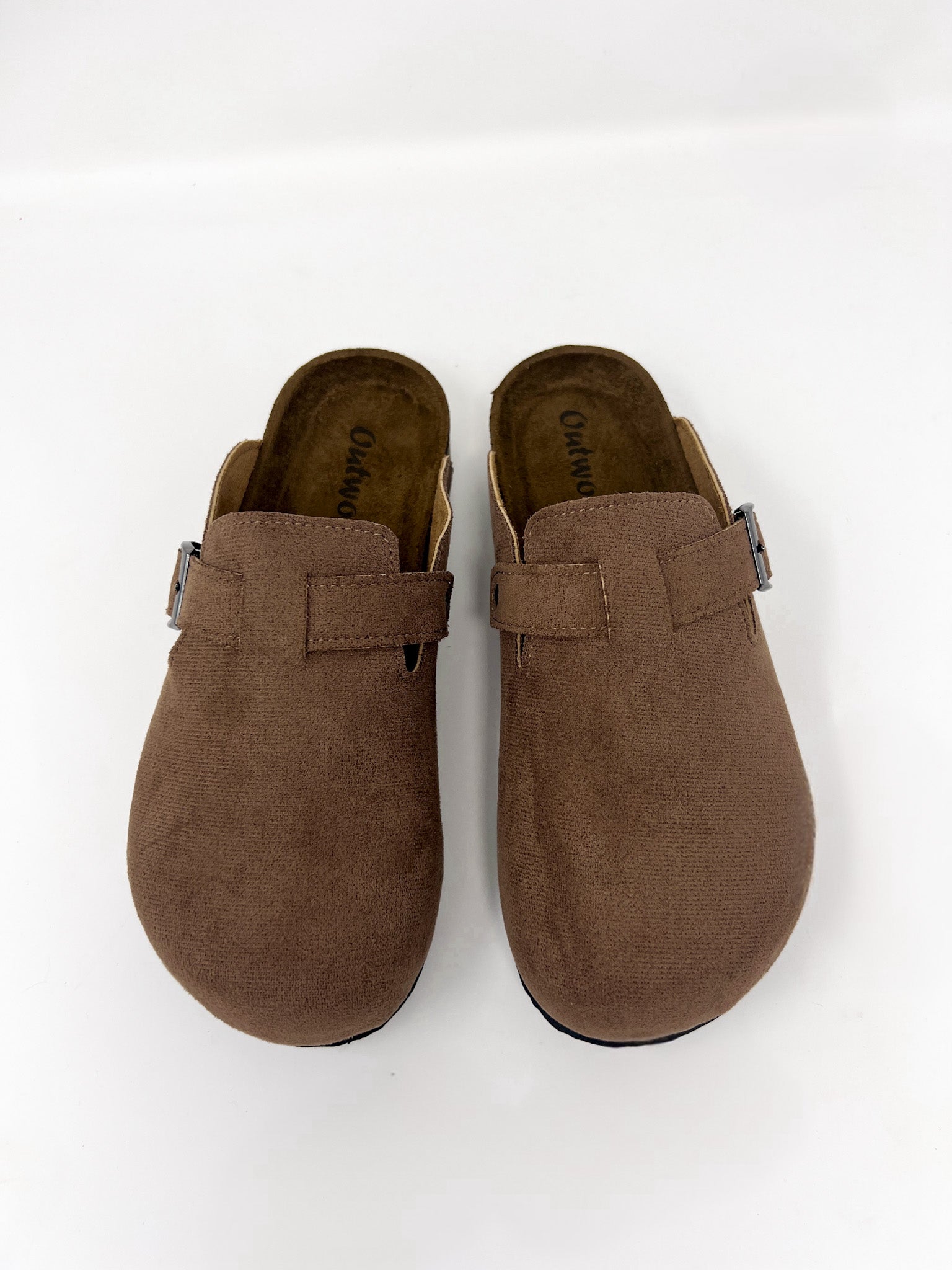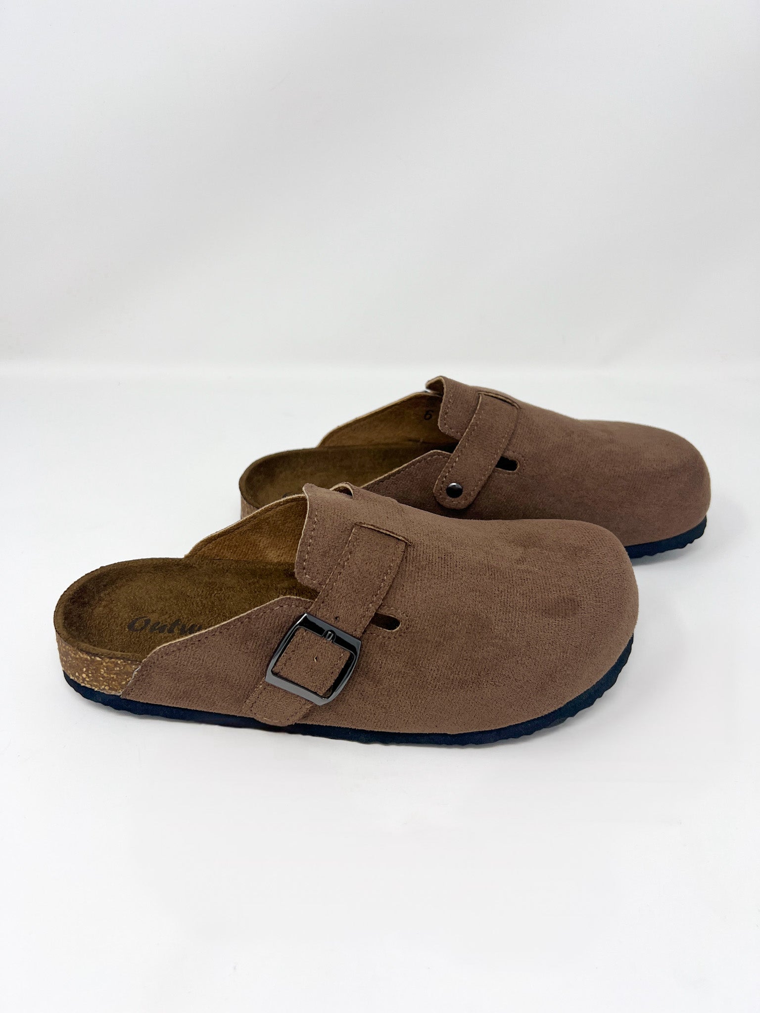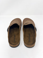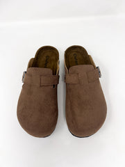 Slide into effortless comfort with these cozy brown suede clogs. Designed with a soft, textured finish and a contoured cork footbed, they’re made for all-day wear. The adjustable buckle adds a touch of edge while ensuring a secure fit. Whether you're lounging or on the go, these laid-back clogs are your go-to for cozy style that doesn’t compromise on cool.