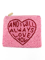 Say hello to your new everyday sweetheart! This pink beaded coin pouch features a bold red heart with the cutest “Always Love You” message woven right in. Fully beaded for that luxe, sparkly texture we LOVE, it’s the perfect pop of pink for tossing in your tote, organizing glam essentials, or gifting to your bestie. Finished with a gold zipper for a touch of shine — because the details matter