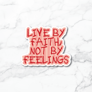 A beautiful and powerful reminder for daily life. This sticker features classic typography and a bold, two-line layout with a heart accent, centered around the timeless message: "Live By Faith Not By Feelings." It's an elegant piece of inspiration to keep close at hand. Perfect for Bibles, devotionals, car bumpers, or quiet spaces.
