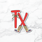 This bold, humorous sticker combines your Texas pride with a love for all things southern. The oversized red 'TX' is paired with a set of boots and lasso.