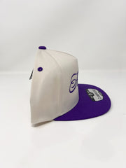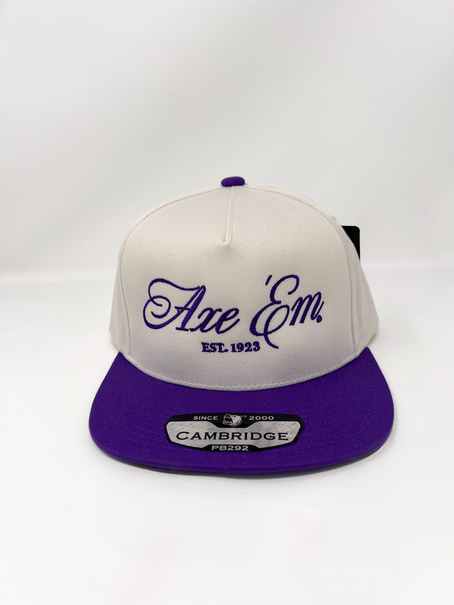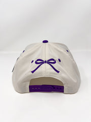 Clean, classic, and full of school spirit—this white canvas trucker hat features a curved purple bill and bold purple "axe em'" script embroidered across the front. And the back? It’s finished with the cutest touch: a purple embroidered bow that adds the perfect girly detail. Whether you're headed to class or the game, this hat is the ultimate blend of sass and spirit.