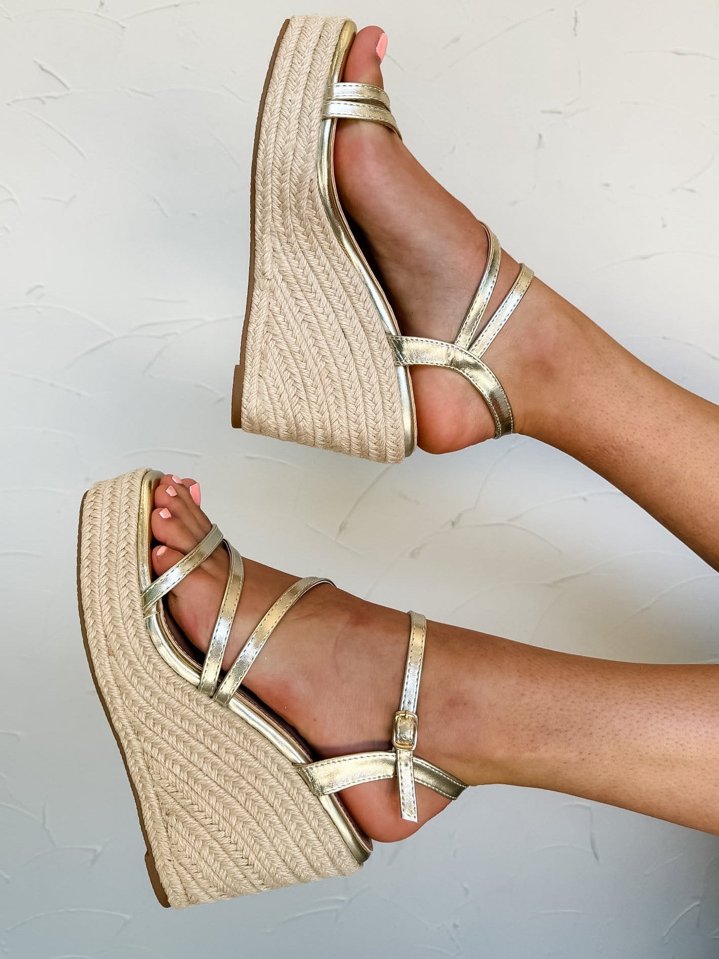 Shimmer into the season with these gold strappy wedges. Featuring delicate metallic straps and a braided espadrille-style platform, these beauties combine elegance with all-day comfort. Perfect for spring parties, beachy brunches, and everything in between.