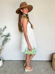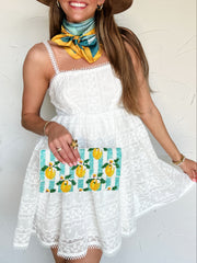 Styled With: Our Farmer Wedges & Lemon Blue Stripe Beaded Clutch & Alivia Flower Teal & Yellow Scarf