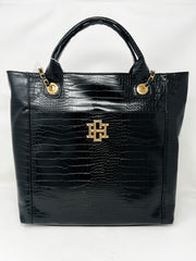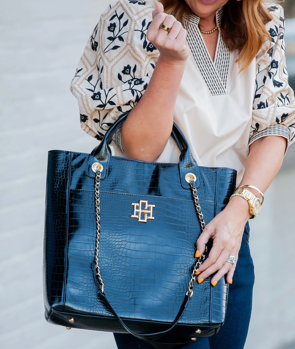 This tall magazine style tote is designed with a stunning vegan leather embossed croc fabric. It's a great, everyday bag that accommodates most laptops with plenty of space for daily essentials. It features a deep magnetic front pocket ideal for a large phone, along with versatile carrying options through short top handles and elongated braided handles. This tote includes a secure magnetic closure, along with two interior open pockets and one zippered pocket for efficient organization. There are feet on the bottom for added protection as well
