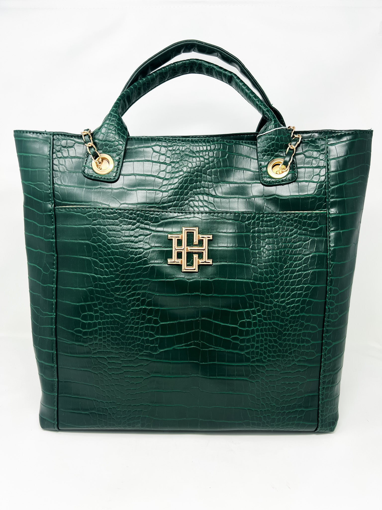 This tall magazine style tote is designed with a stunning vegan leather embossed croc fabric. It's a great, everyday bag that accommodates most laptops with plenty of space for daily essentials. It features a deep magnetic front pocket ideal for a large phone, along with versatile carrying options through short top handles and elongated braided handles. This tote includes a secure magnetic closure, along with two interior open pockets and one zippered pocket for efficient organization. There are feet on the bottom for added protection as well.