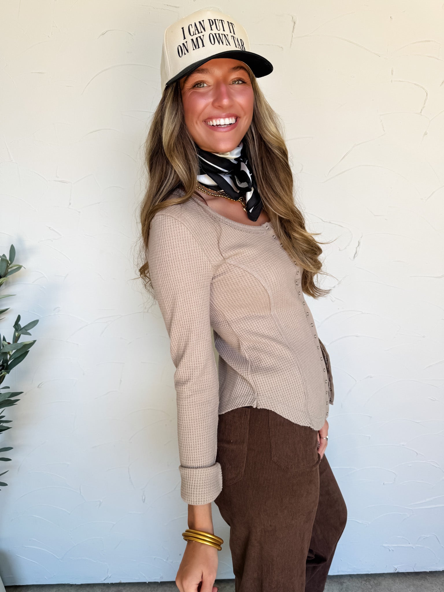 Styled With: Our Vicky Ivory Cheetah Scarf & Make Me A Deal Corduroy Pants- Mocha & My Own Tab Cap