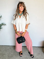 Styled With: Our Let's Hit The Road Elastic Waist Checkered Casual Pants- Red & {CH} Elle Crossbody Black DQ & Colette Sandal- Black