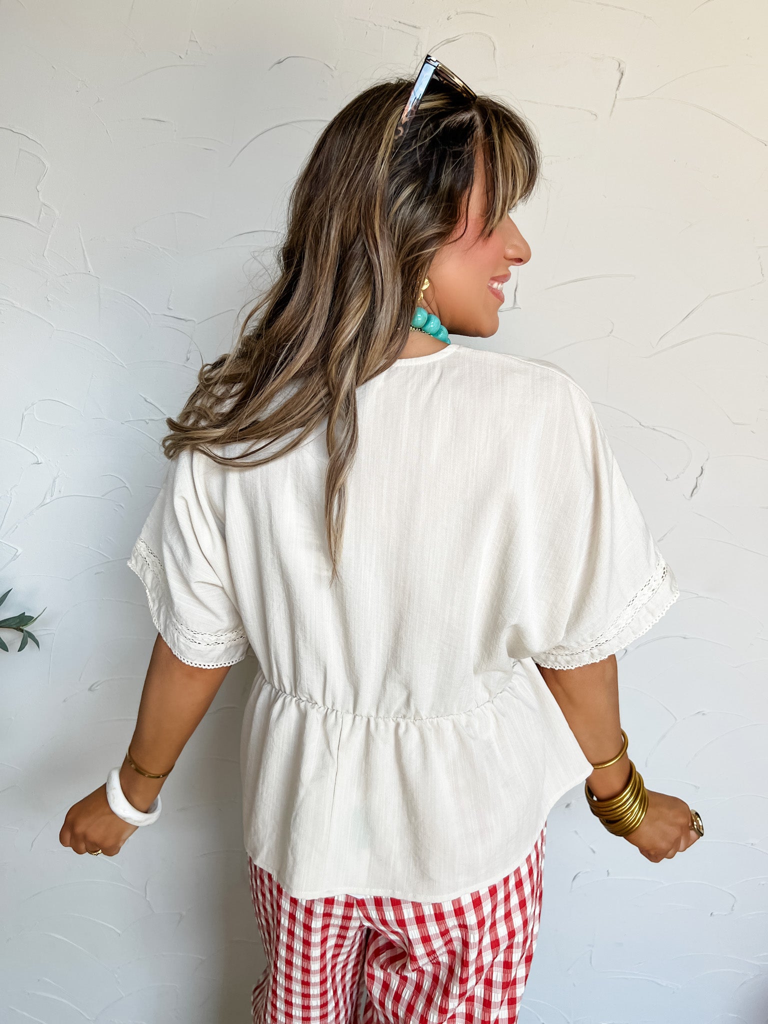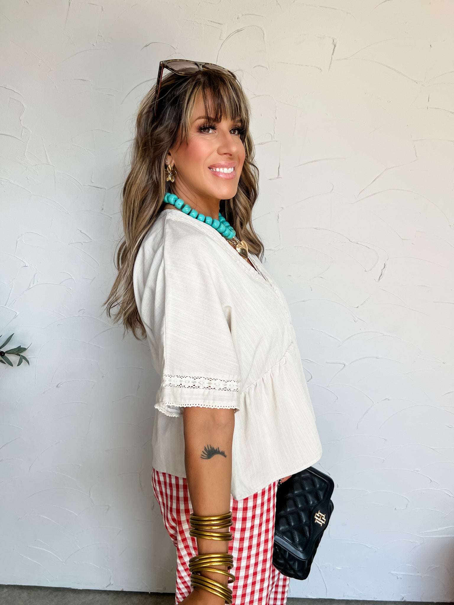 Hold Onto You Lace Trim Peplum Top- Ecru