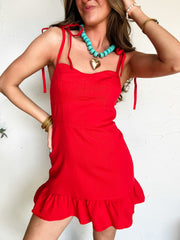 Shoot Your Shot Denim Shoulder Tie Mini Dress- Red