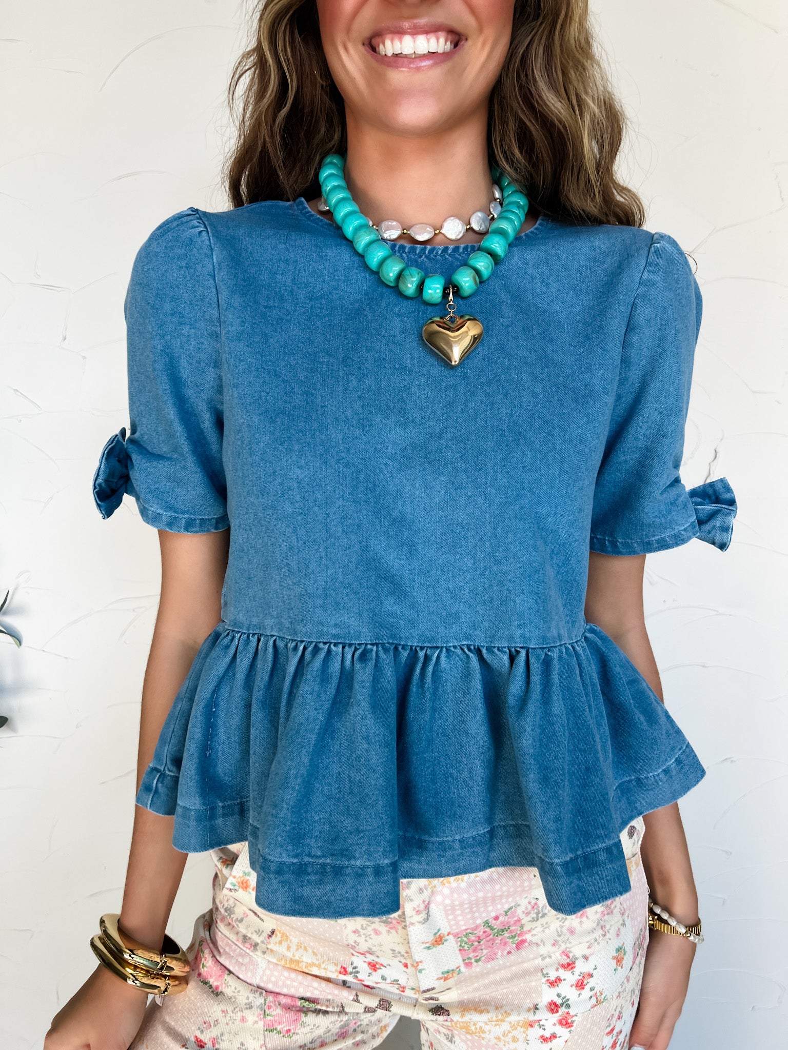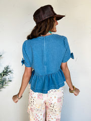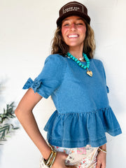 Wish You Were Here Denim Bow Peplum Top