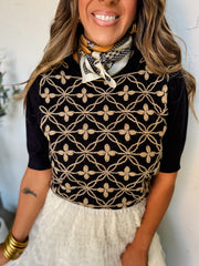 Against The Grain Embroidered Short Sleeve Sweater-Black Sand