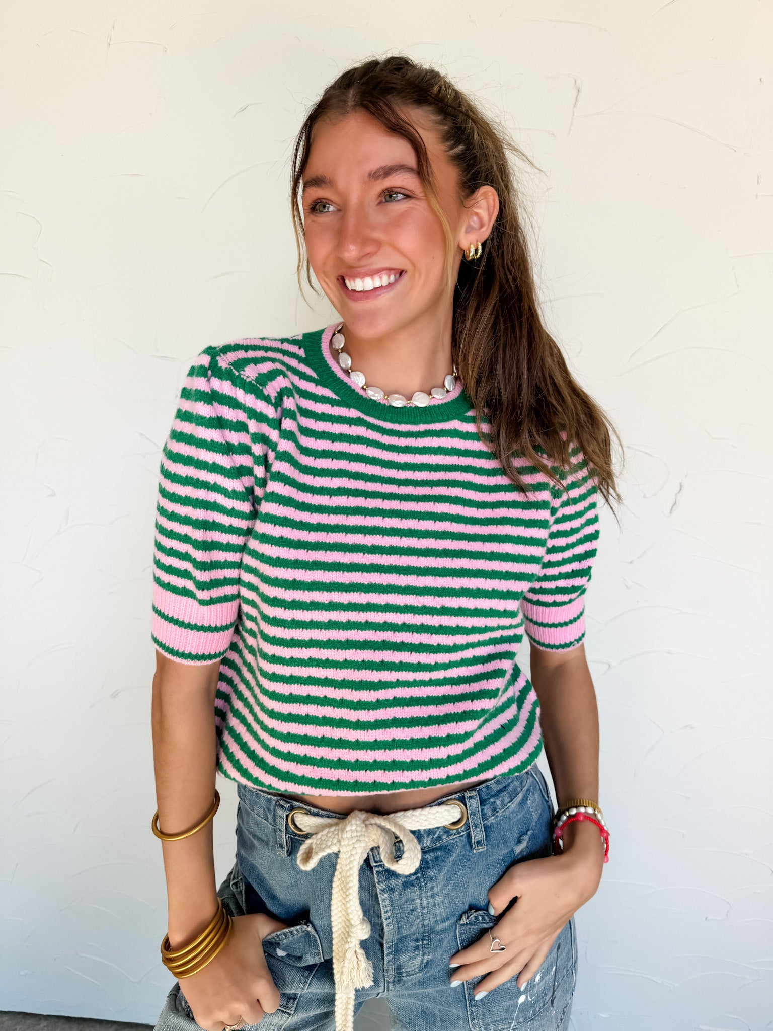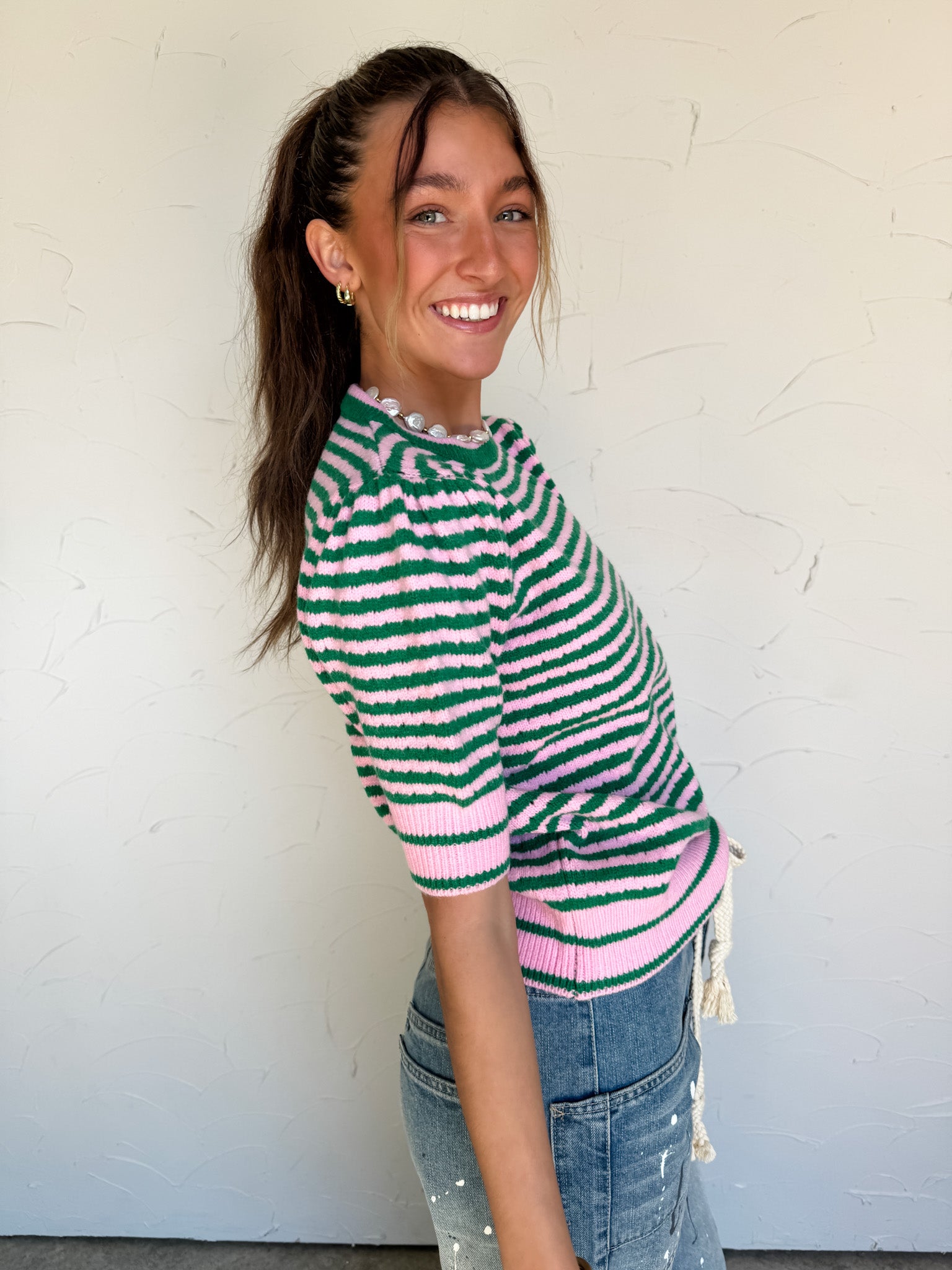 Give Me The Truth Striped Pointelle Sweater- Green/Pink