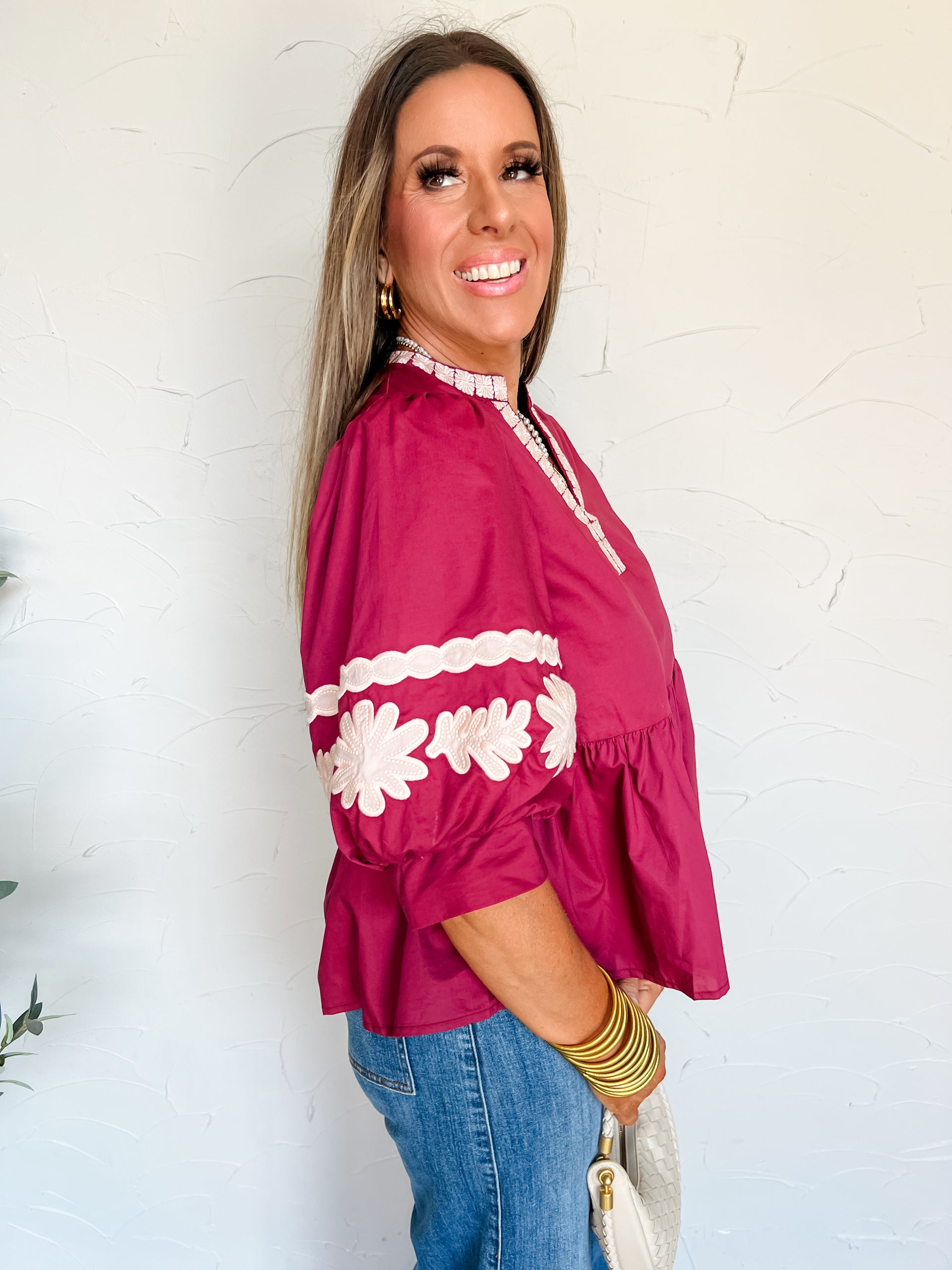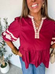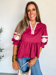 Sweet Moments Embroidered Sleeve Top- Merlot