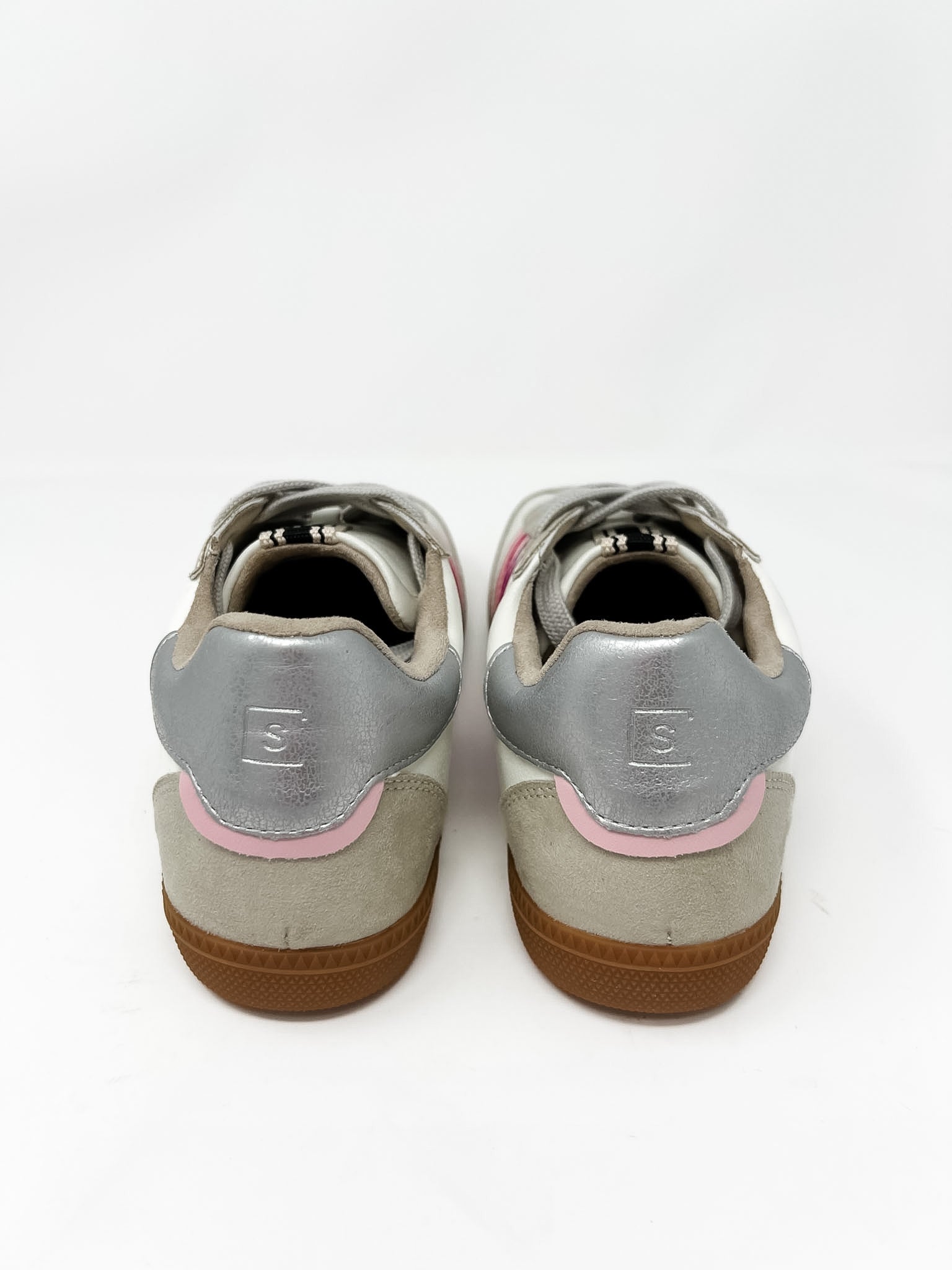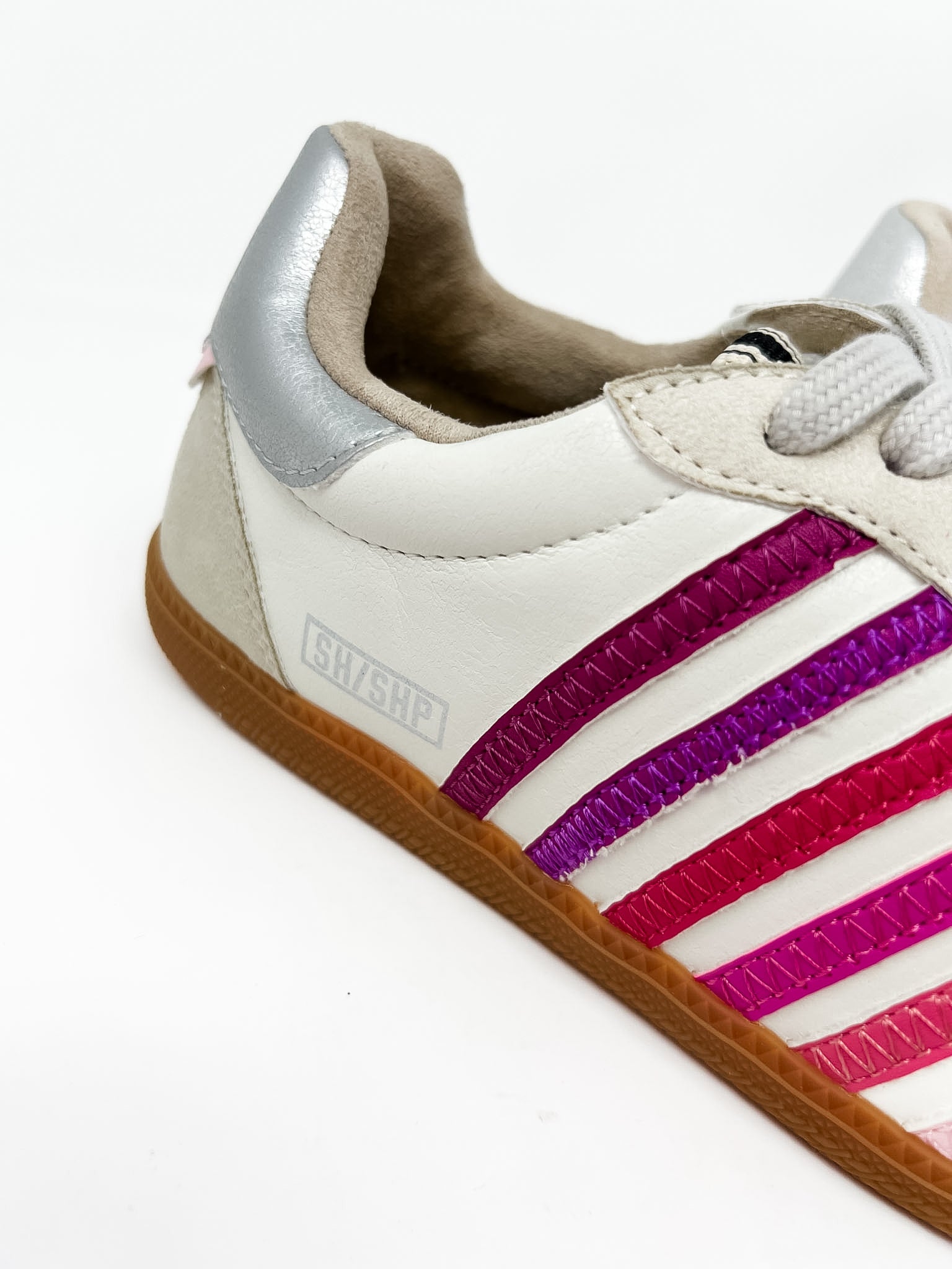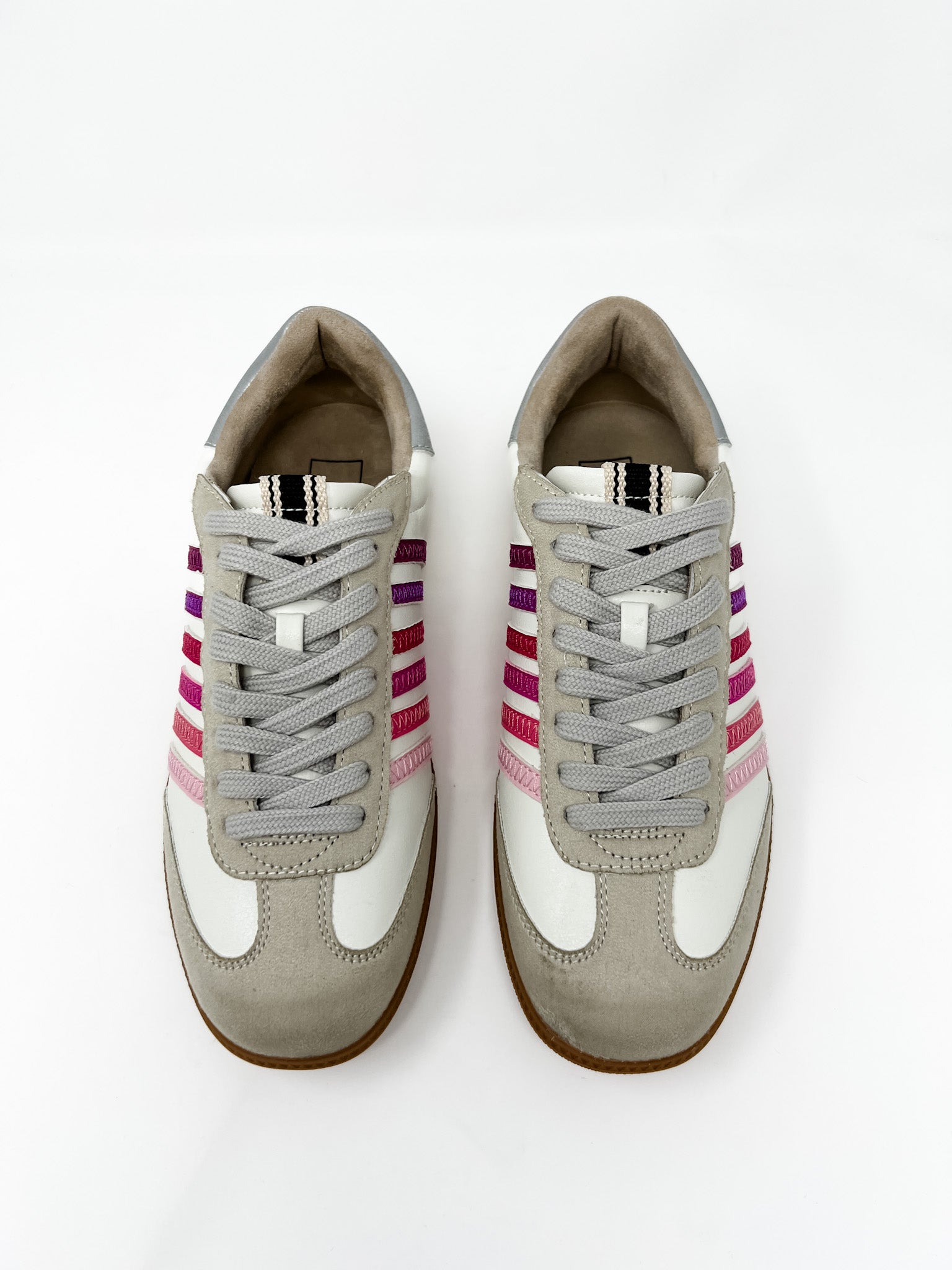 Step up your sneaker game with these effortlessly cool, girly-chic kicks! Featuring a creamy neutral base with soft suede accents, these sneakers get a playful pop from bold pink and berry-toned stripes along the sides. The gum sole adds that vintage-inspired touch while keeping things versatile for everyday wear.