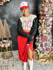 Styled With: Falling For You Crinkled Satin Skirt, Happy Santa Foam Hat, Joyful Graphic Tee