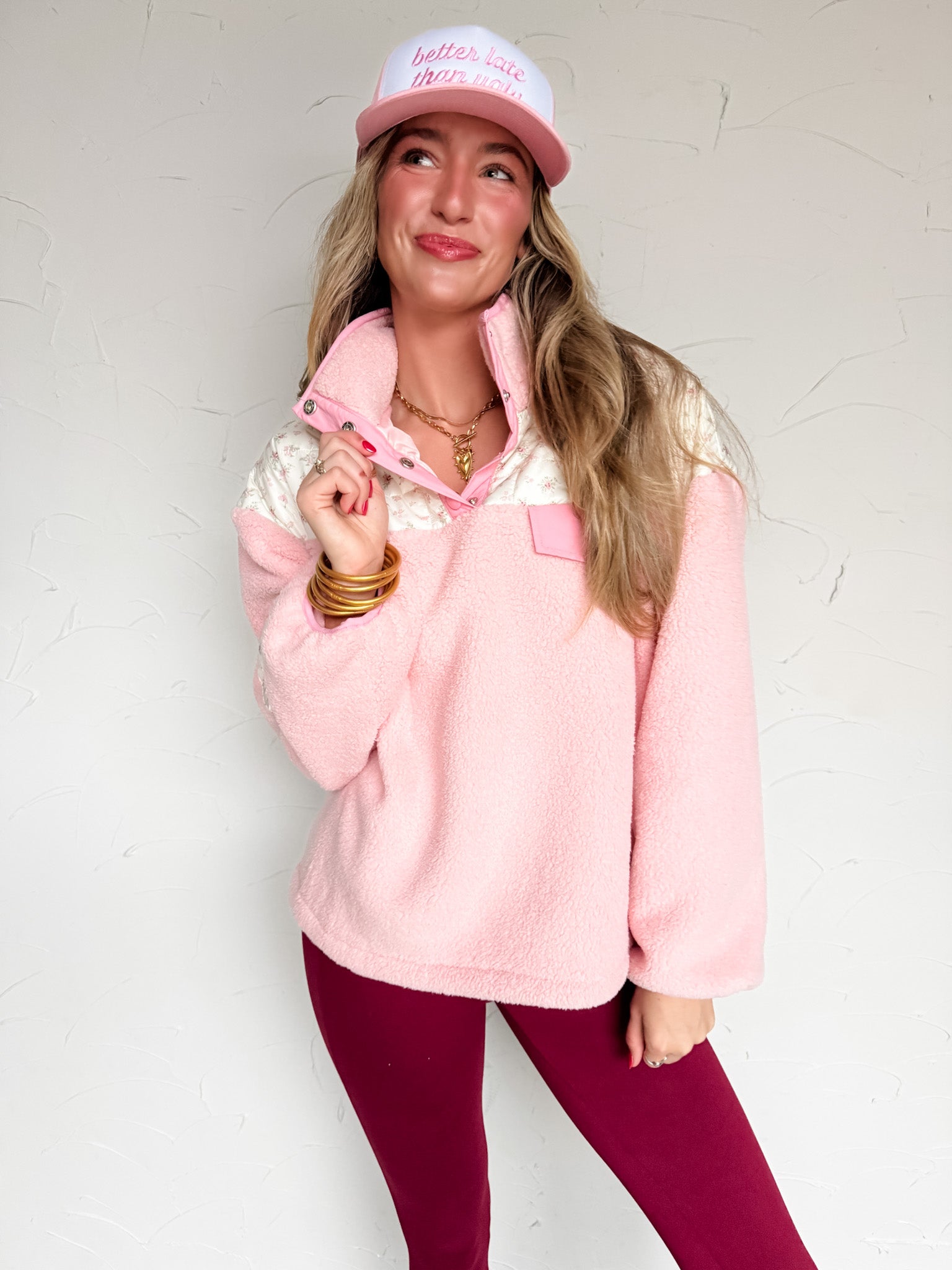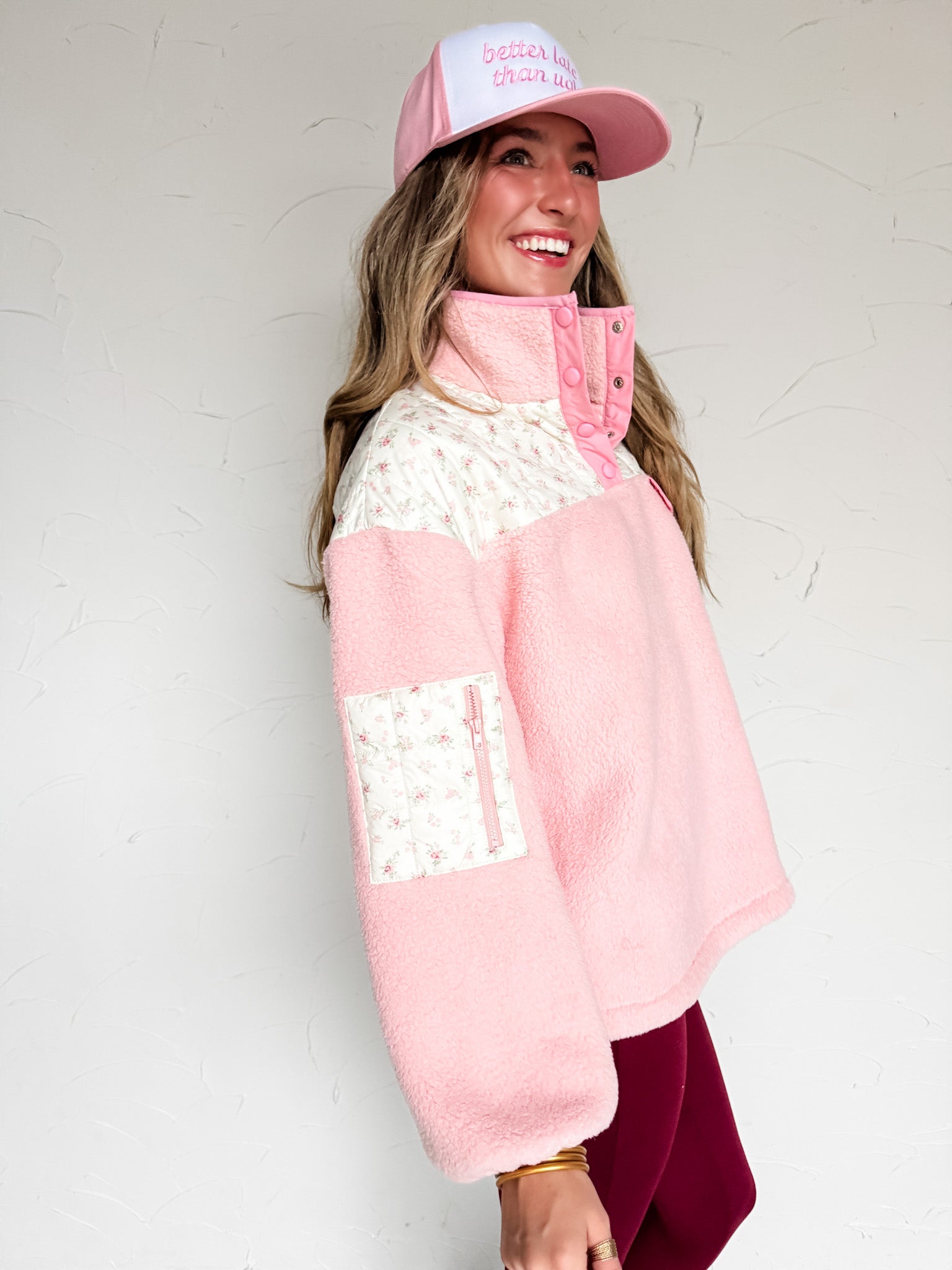 Talk To Me Floral Contrast Fleece Pullover- Pink