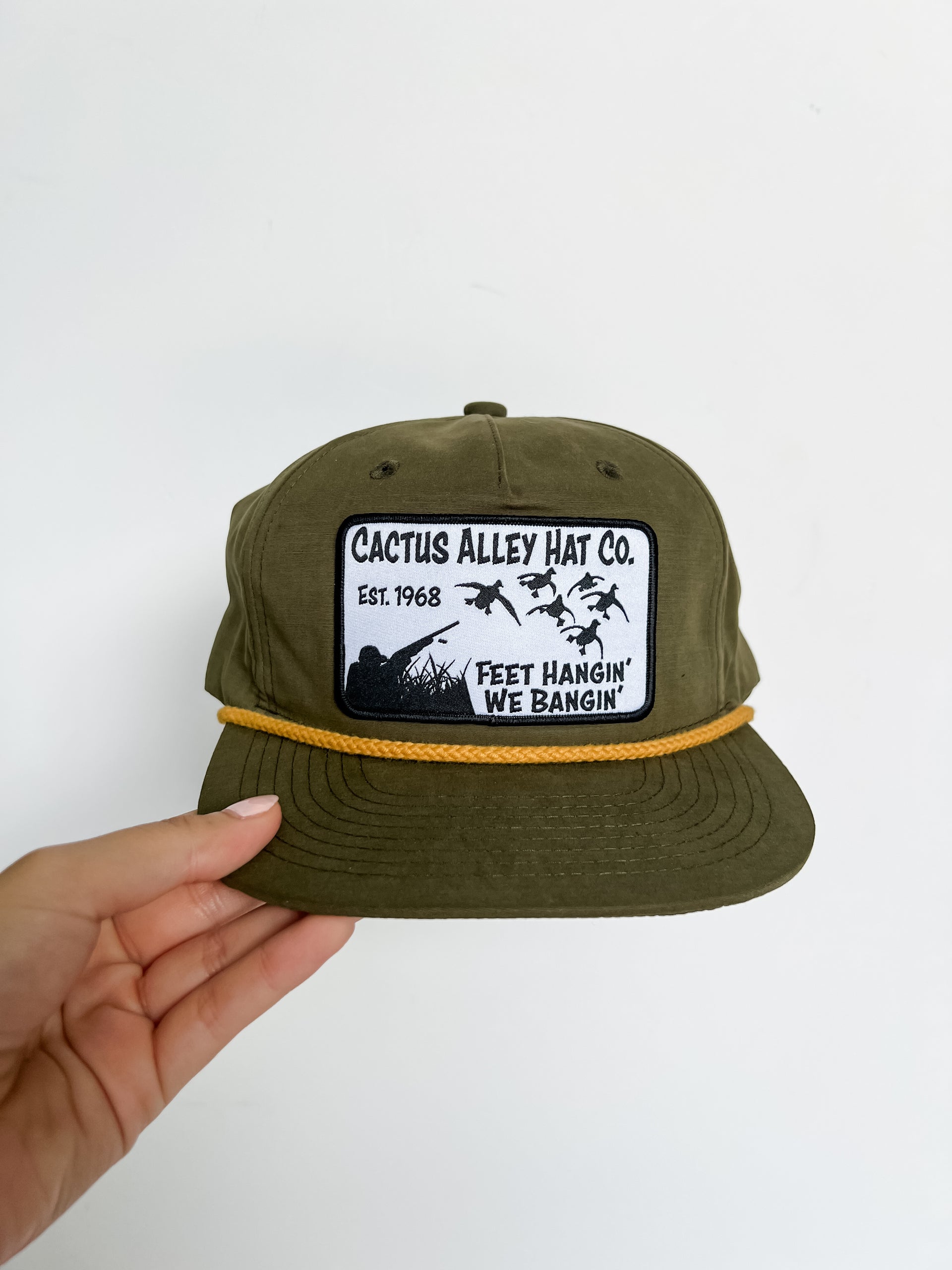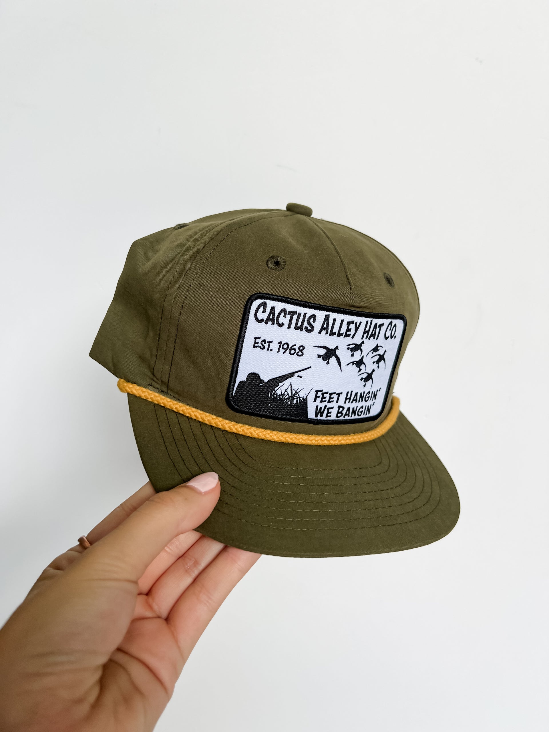 Get ready to hang loose with the Feet Hangin Hat in hunter green and yellow! This unique rope hat features a playful patch detail, perfect for adding a quirky touch to any outfit.