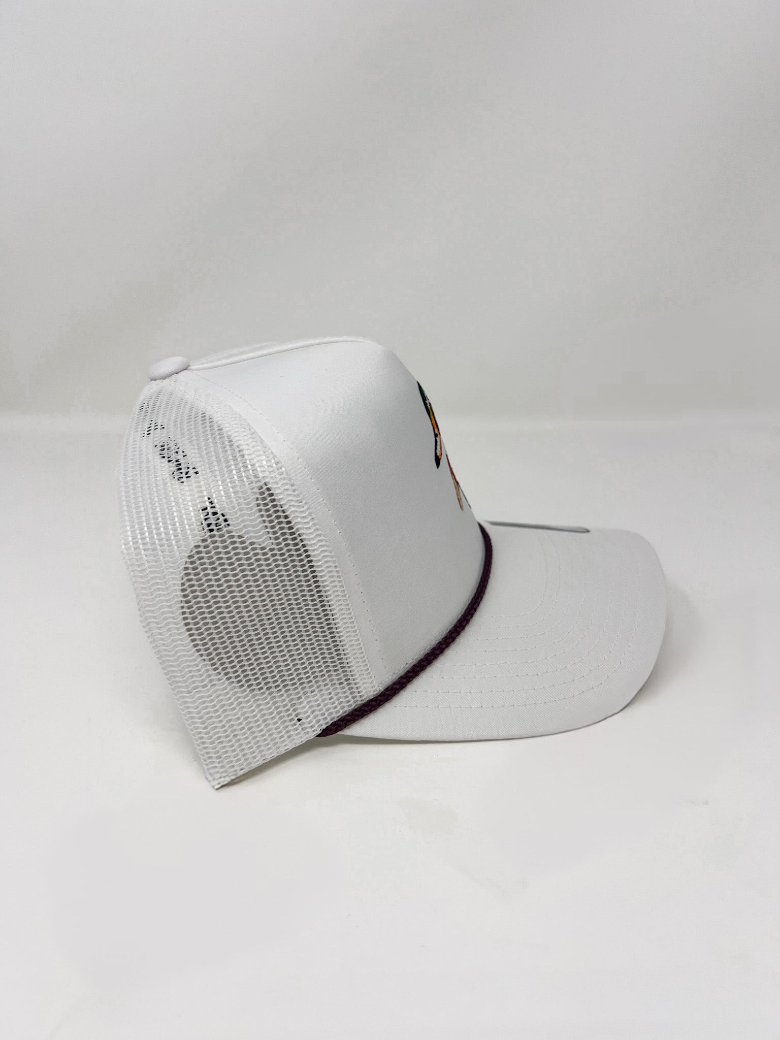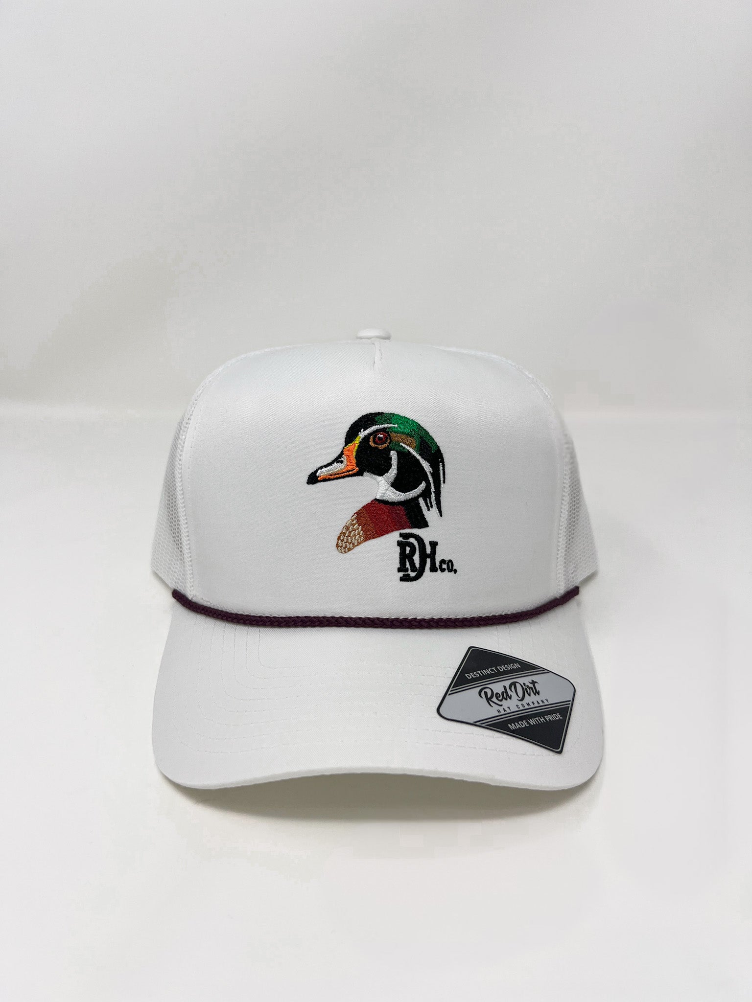 Clean, classic, and made for the outdoors. This all-white trucker hat features a maroon rope detail across the bill and a full-color embroidered duck front and center. Whether you're headed to the lake or just repping your southern roots, this cap brings laid-back charm with a sporting twist.