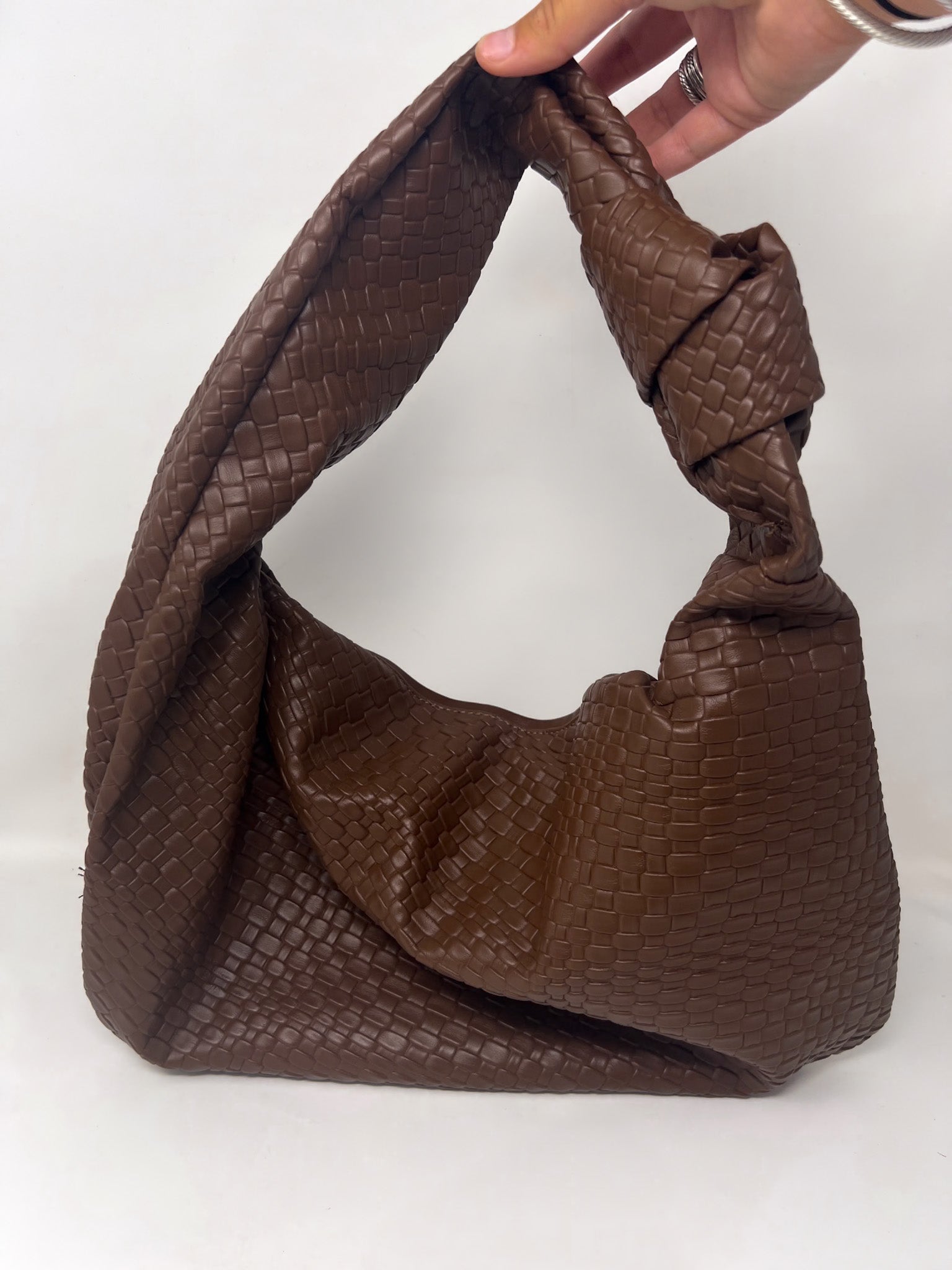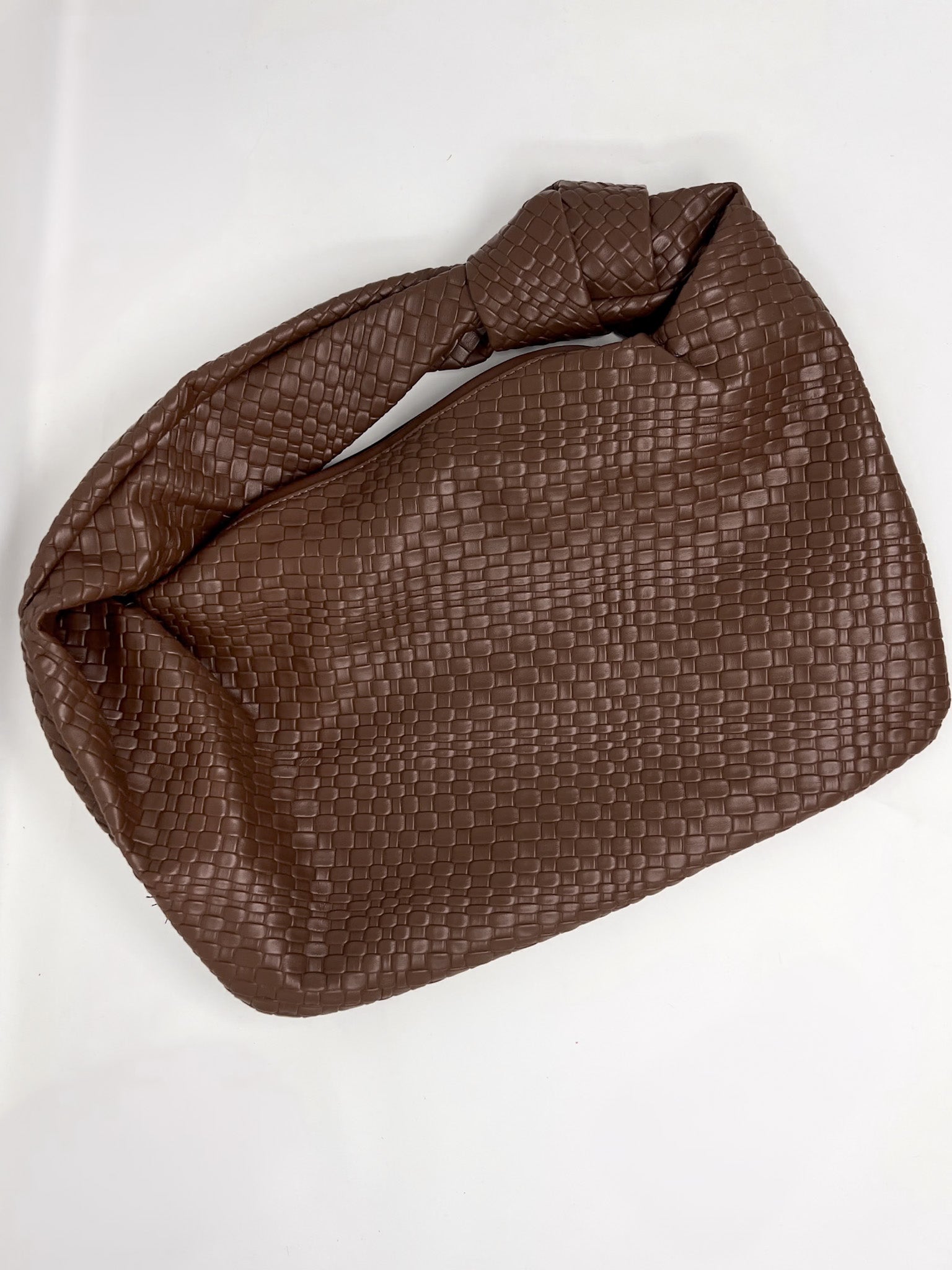 Chic meets effortless with this brown braided shoulder bag. Featuring a luxe woven texture and a trendy knot tie strap, it's the perfect Bottega-inspired dupe without the splurge. Roomy yet stylish, it adds a high-fashion touch to your everyday look.