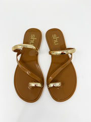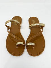 Meet your new everyday glam flat. This glossy caramel sandal features sleek metallic gold straps and a modern toe loop design for a polished, elevated look. The warm neutral base pairs perfectly with anything in your closet, while the bold gold hardware adds just the right amount of shine. Effortless, chic, and made to stand out.