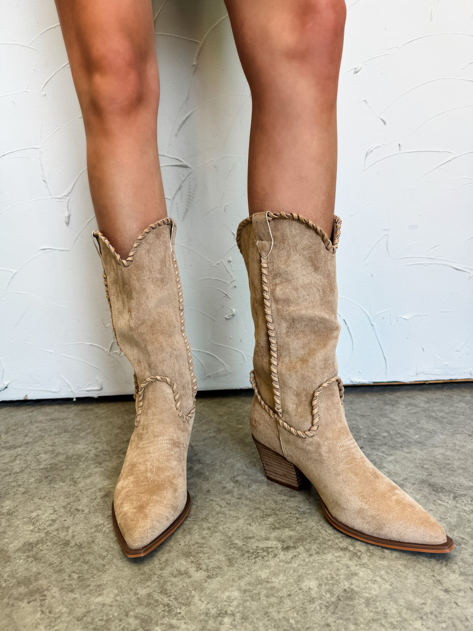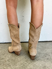 Rich brown suede western boots featuring intricate stitched embroidery throughout the shaft. Finished with a pointed toe, easy on/off, and a comfortable stacked heel. A polished yet laid-back style that adds Western charm to any outfit.