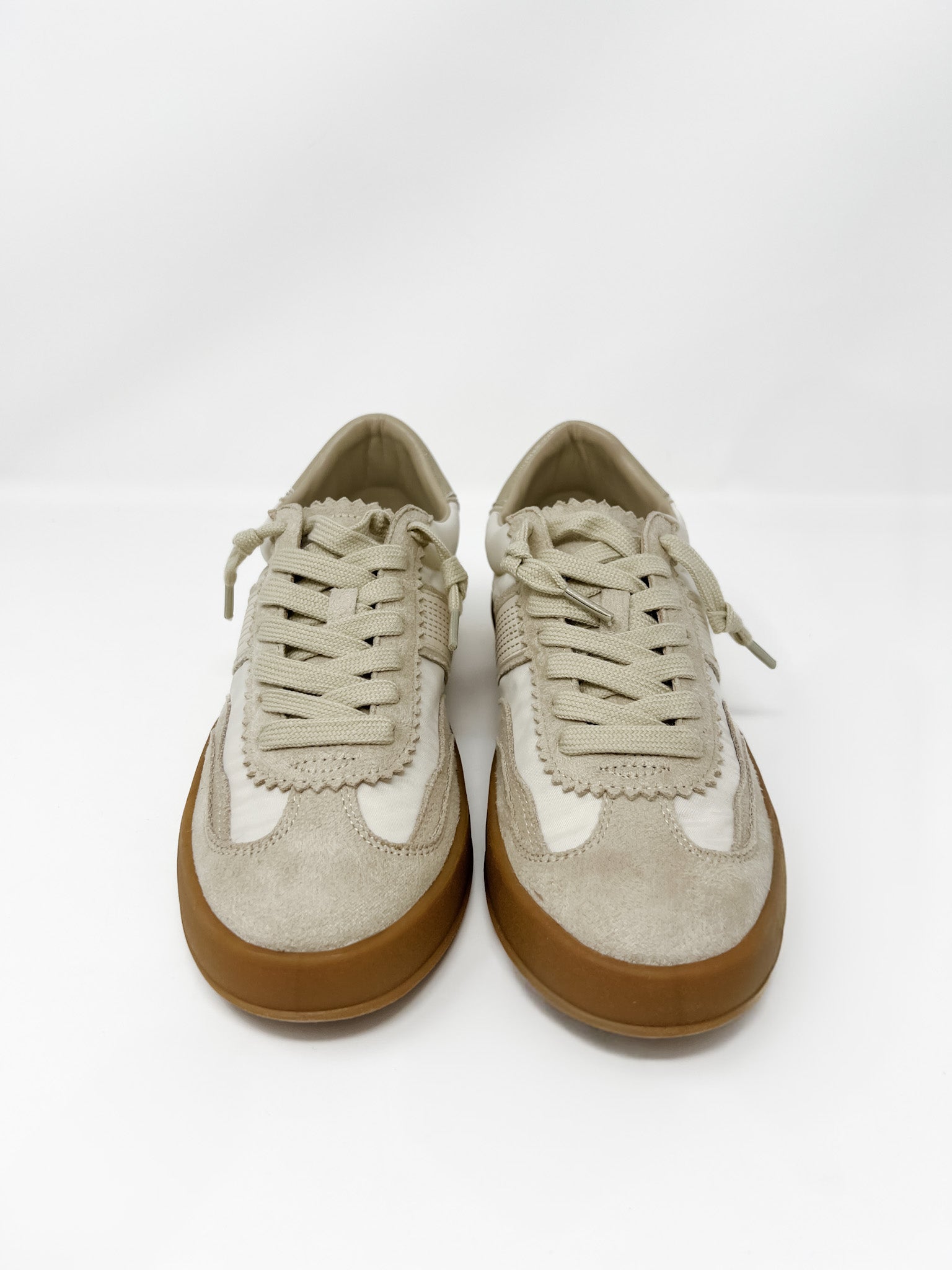 Sleek, simple, and effortlessly cool. These neutral cream sneakers combine soft suede and smooth panels for a chic, tonal look that goes with everything. Finished with scalloped edges and a retro-inspired gum sole, they’re the perfect blend of minimal and stylish—your new go-to sneakers for everyday wear.