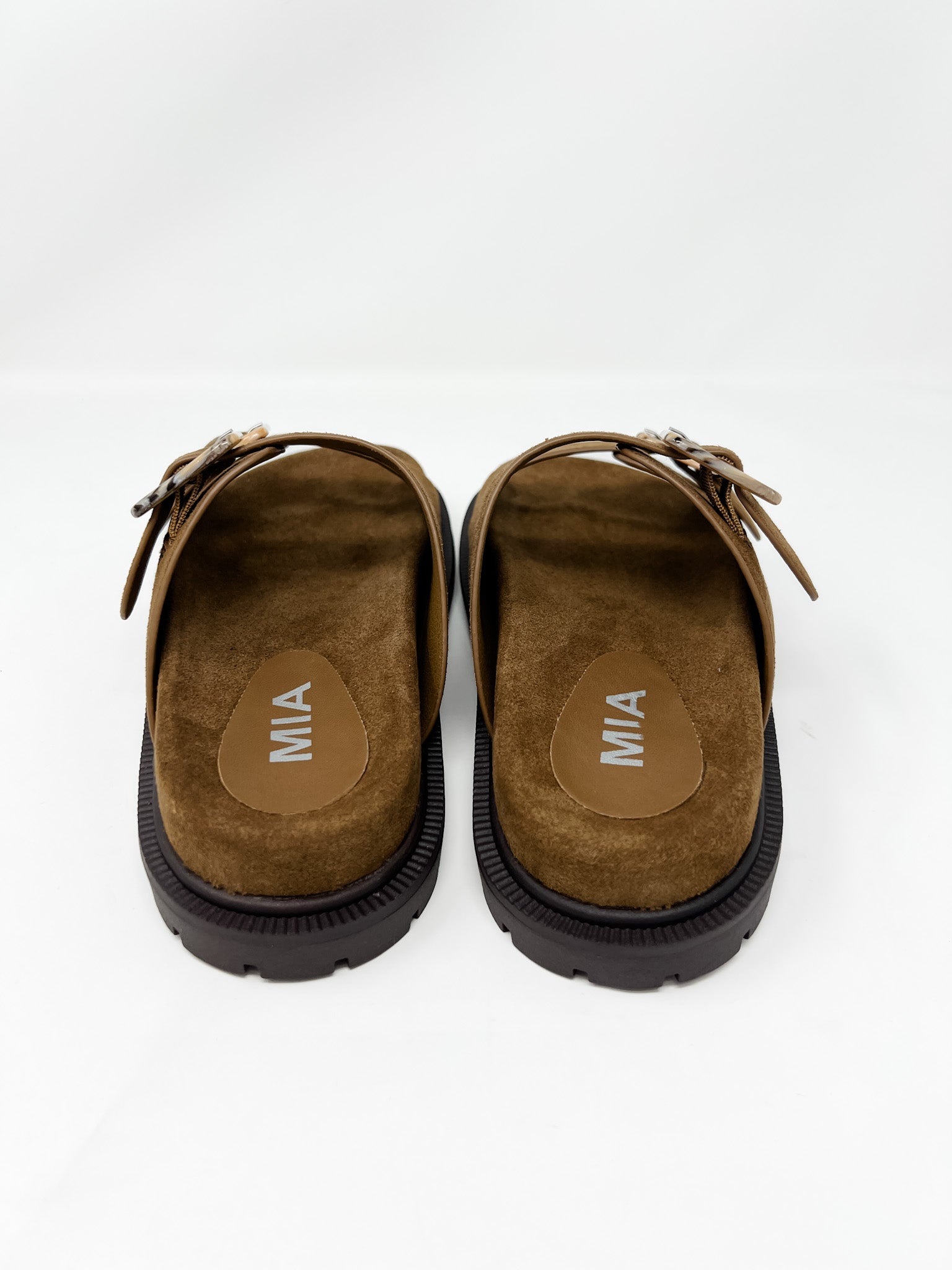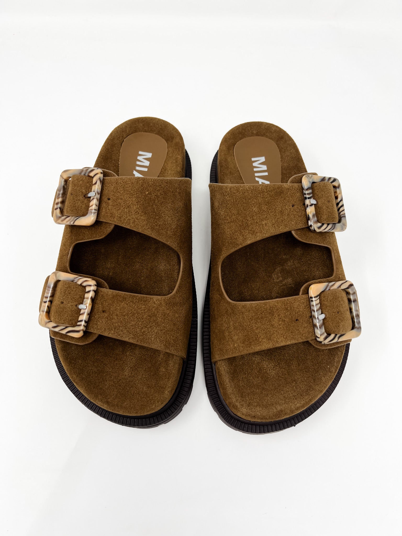 Soft brown suede sandals with dual buckle straps, a chunky sole, and a stripe detail on buckles. Designed for comfort and durability while maintaining a stylish, laid-back vibe. Ideal for everyday wear, travel, or pairing with relaxed summer outfits.