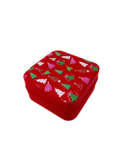 A merry mix of pink and green Christmas trees on red — the ultimate festive must-have! Keep your sparkle safe this holiday season with these adorable zip-up jewelry boxes! Each one features festive prints, soft interiors, and divided sections for rings, earrings, and necklaces — perfect for travel, stocking stuffers, or gift exchanges.