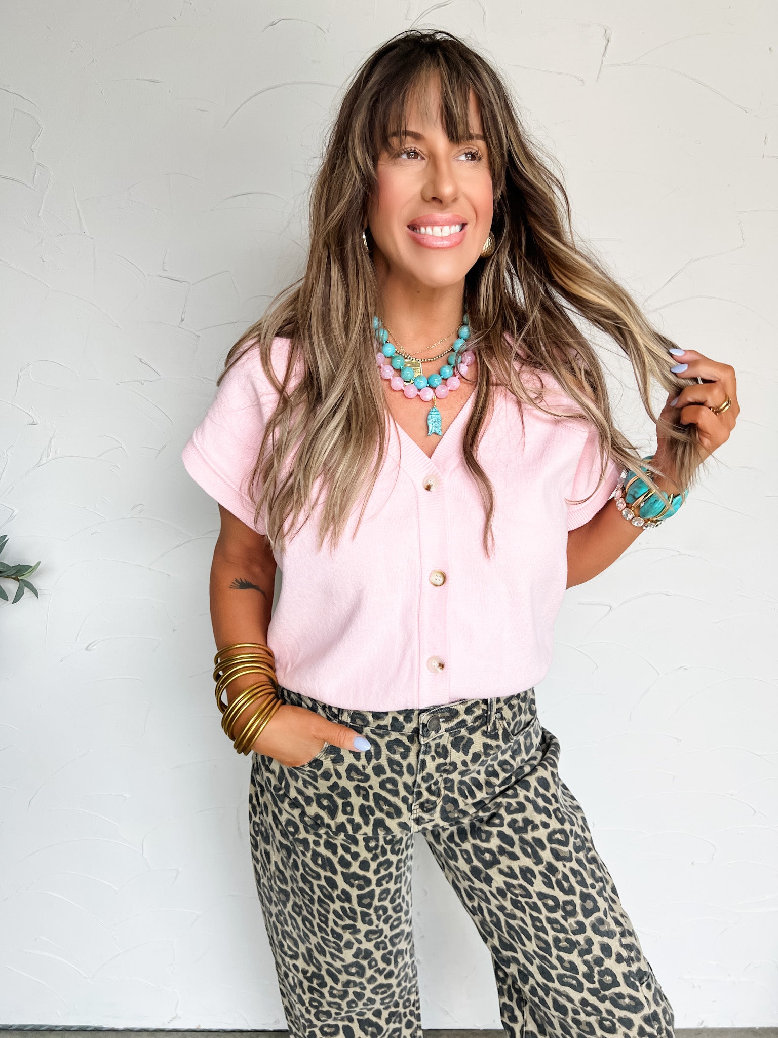 Styled With: Our {Gemelli} Mabry Chunky Beaded Necklace- Turquoise & {Gemelli} Kiawah Beaded Fish Charm Necklace- Pink & I Have Fierceness Cheetah Pants & Stevie Sneaker- Light Gold