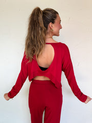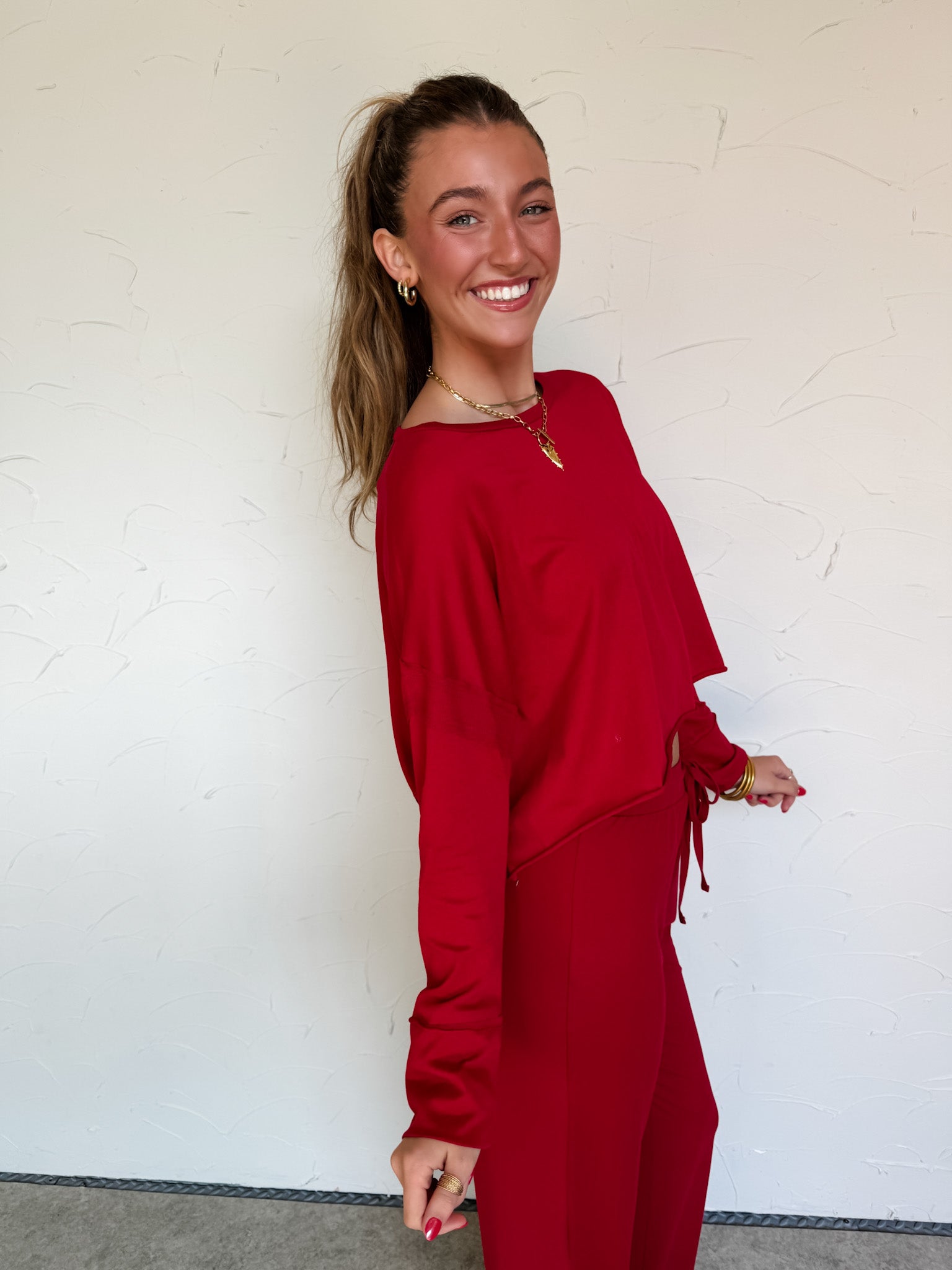 Styled With: Our Stay In Motion Knit Jersey Wide Leg Pants- Cherry
