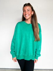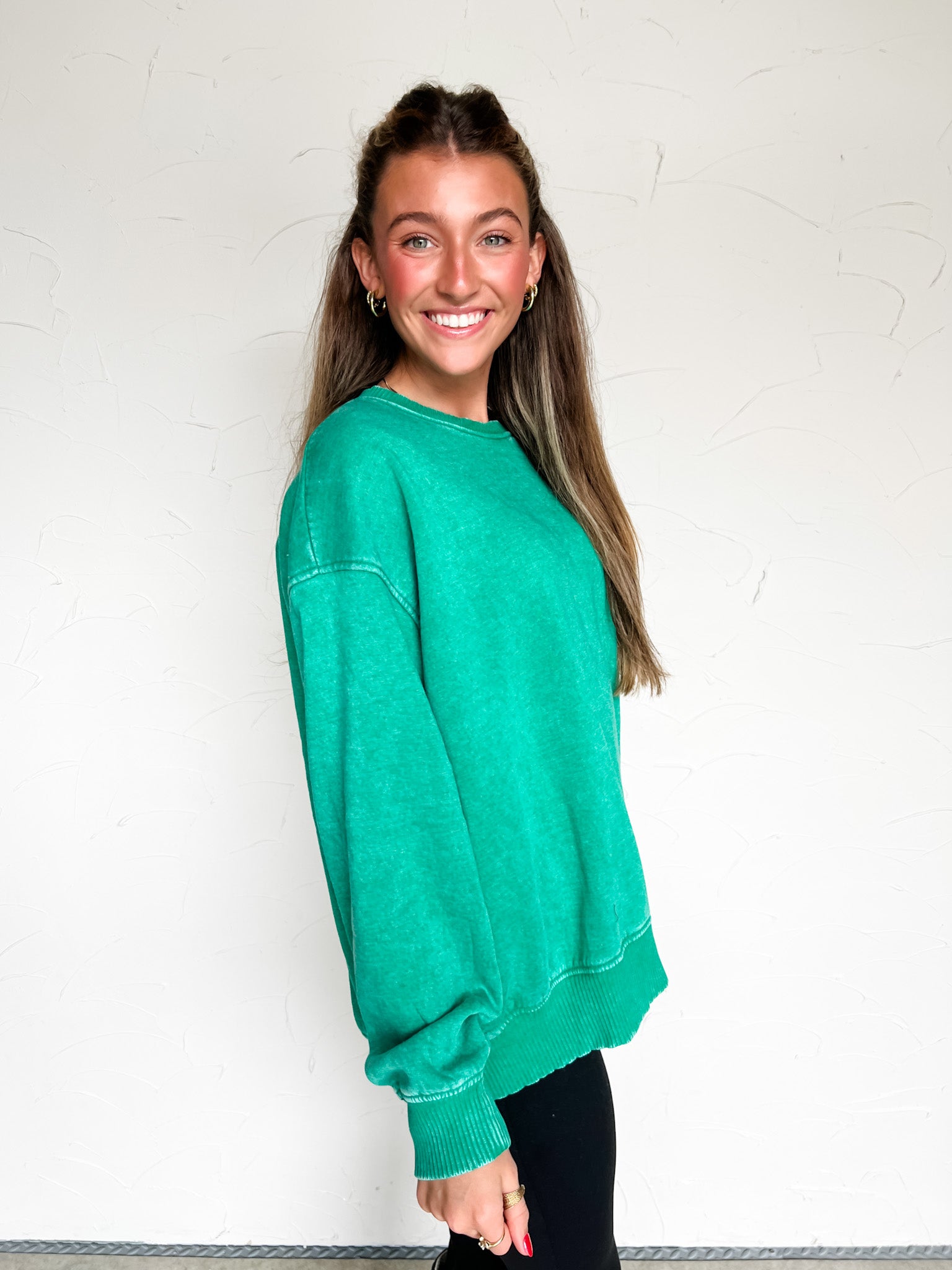 Get To Know Me Acid Wash Fleece Pullover- Kelly Green