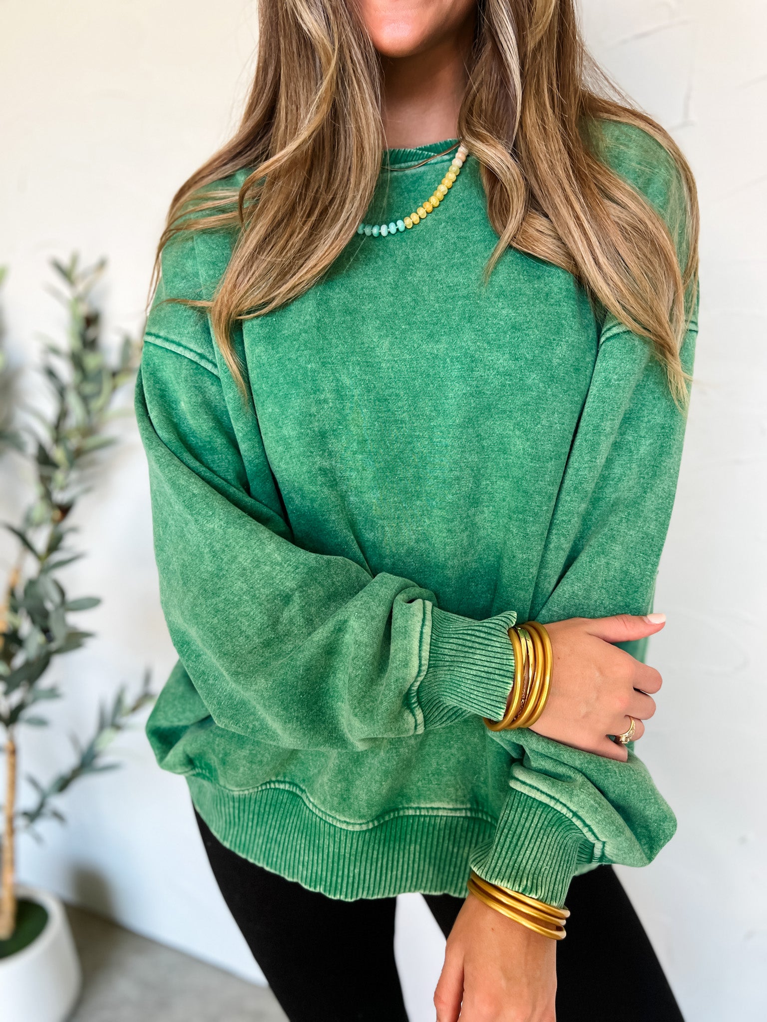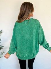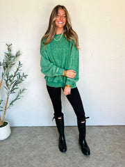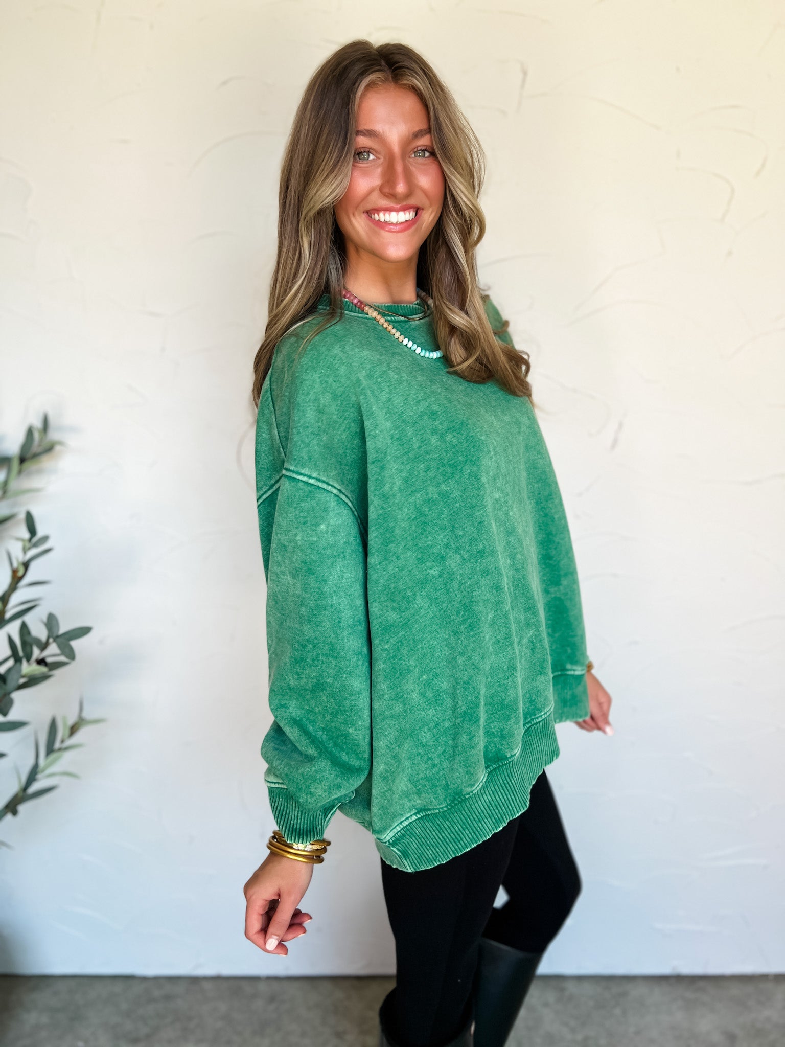 Get To Know Me Acid Wash Fleece Pullover- Forest