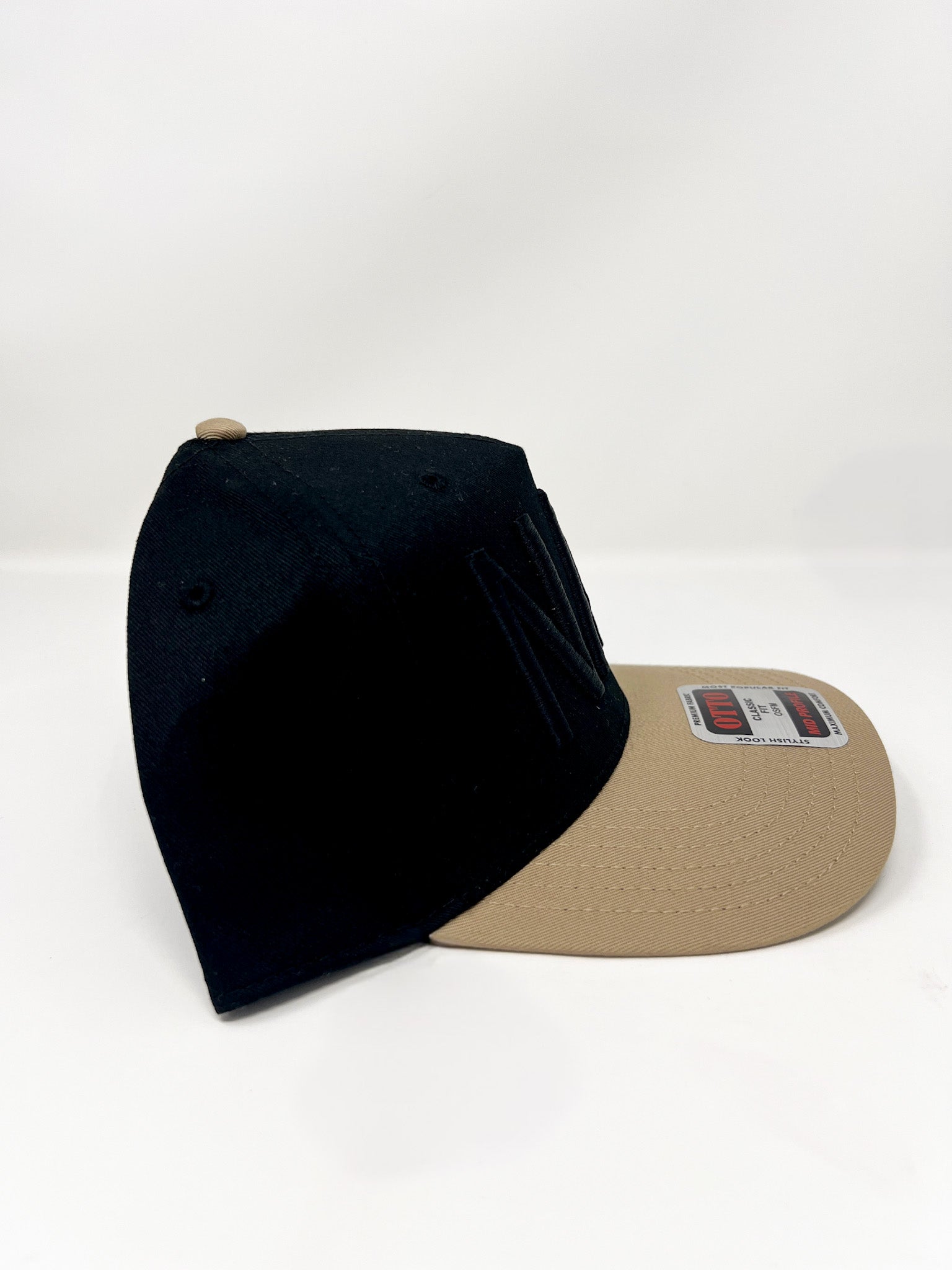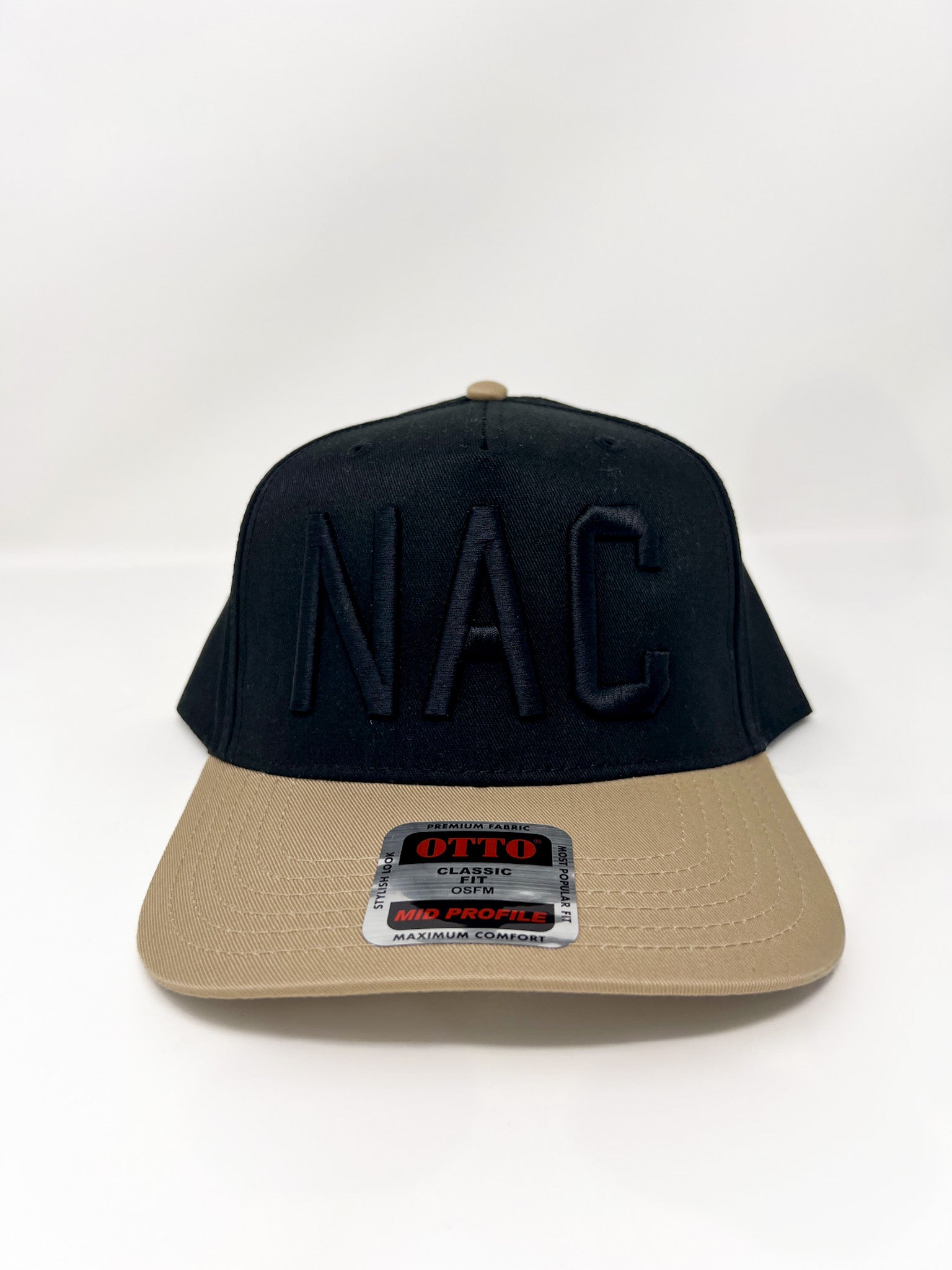 Understated and edgy—this black and tan trucker hat features a clean monochromatic black-on-black “NAC” embroidery on the crown with a tan bill for contrast. It’s sleek, neutral, and easy to style, whether you're on campus or keeping it casual.