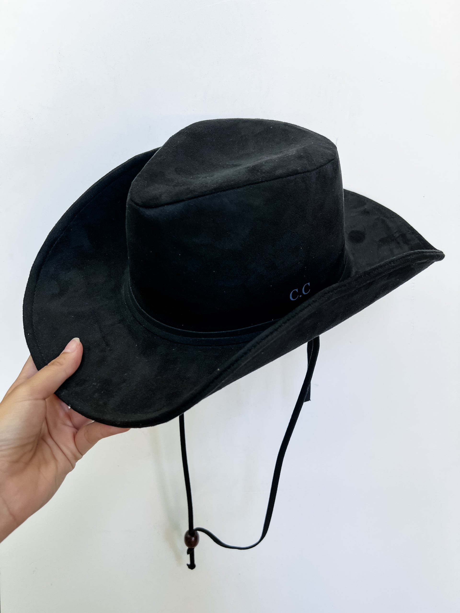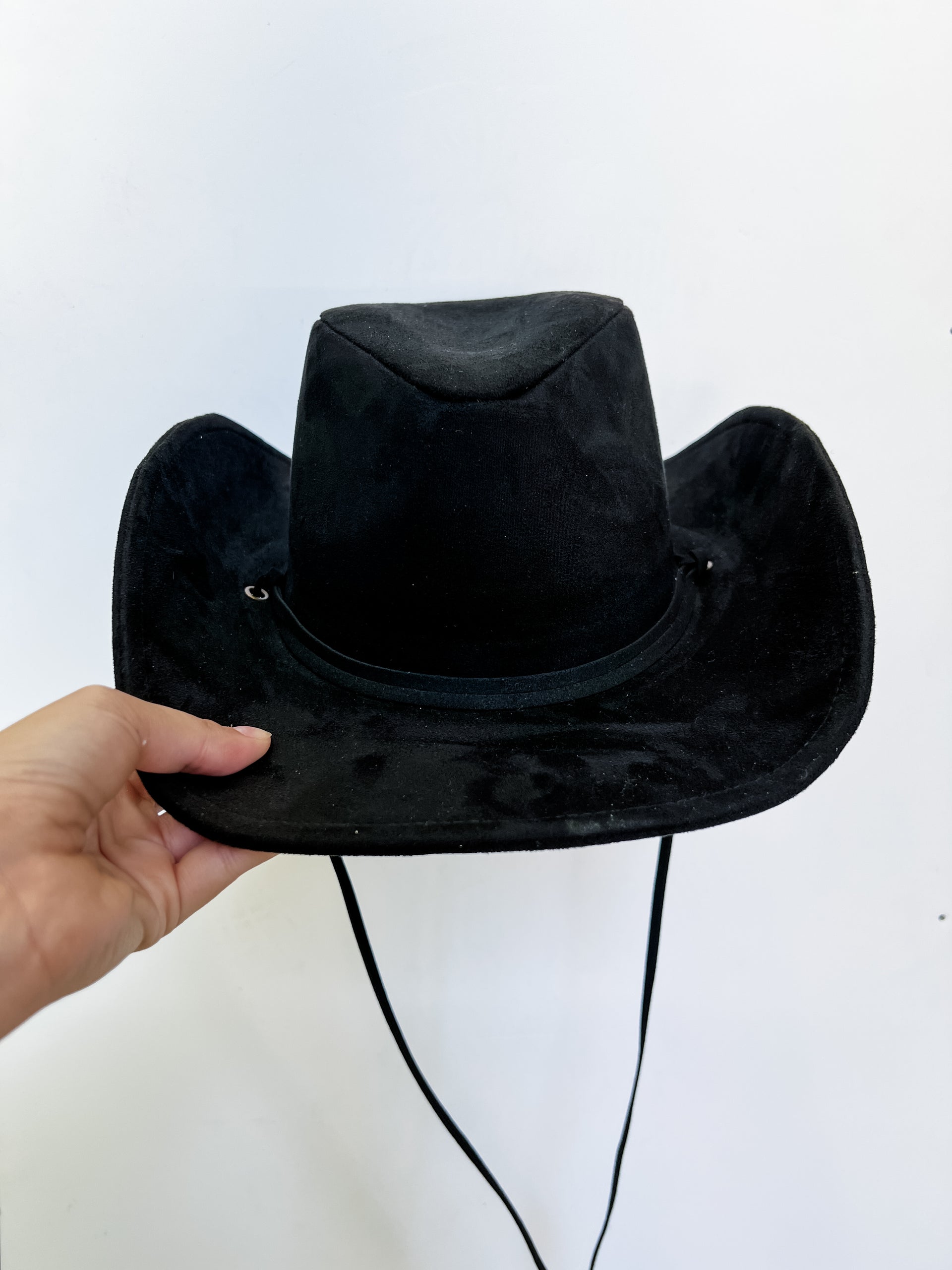 Stay stylish with our She's All Country Suede Cowboy Hat in black. The adjustable strap ensures a comfortable fit while the classic design adds a touch of western charm to any outfit. Stay cool and confident with this versatile accessory.